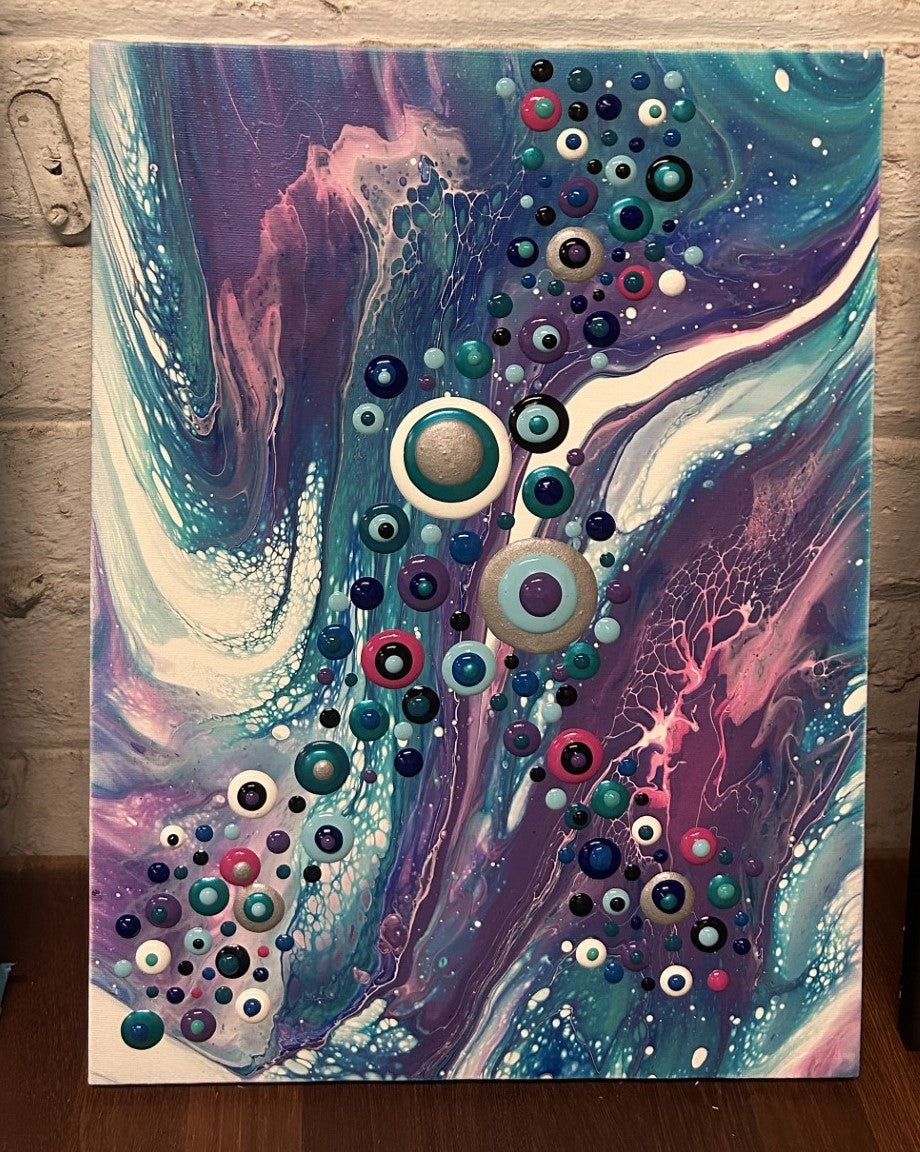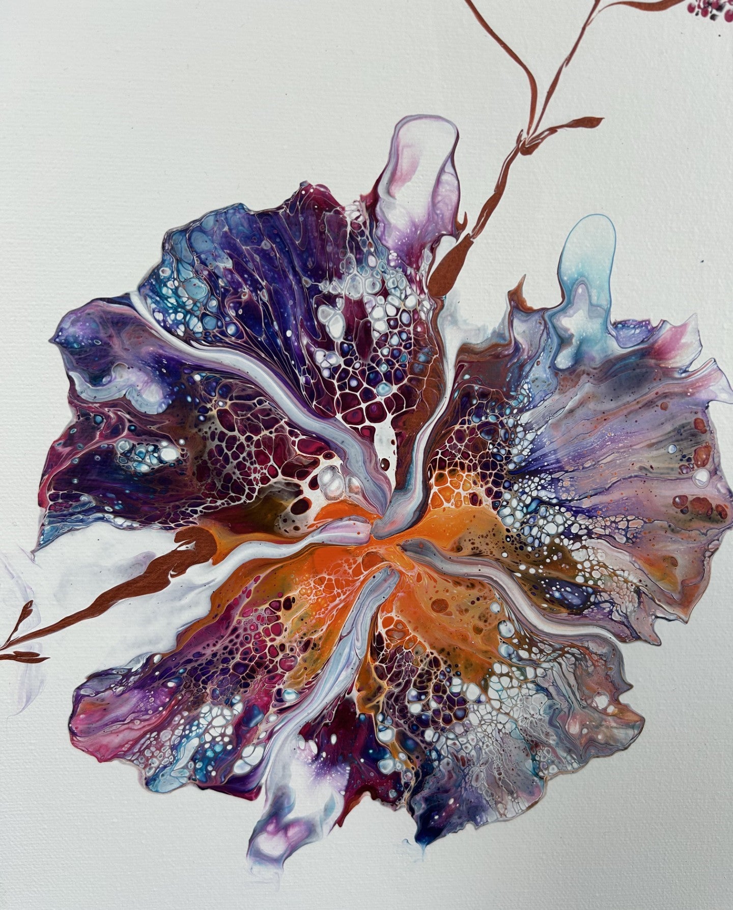 30cm x 40cm acrylic on canvas. Deconstructed blooms with co-ordinating dots on top.