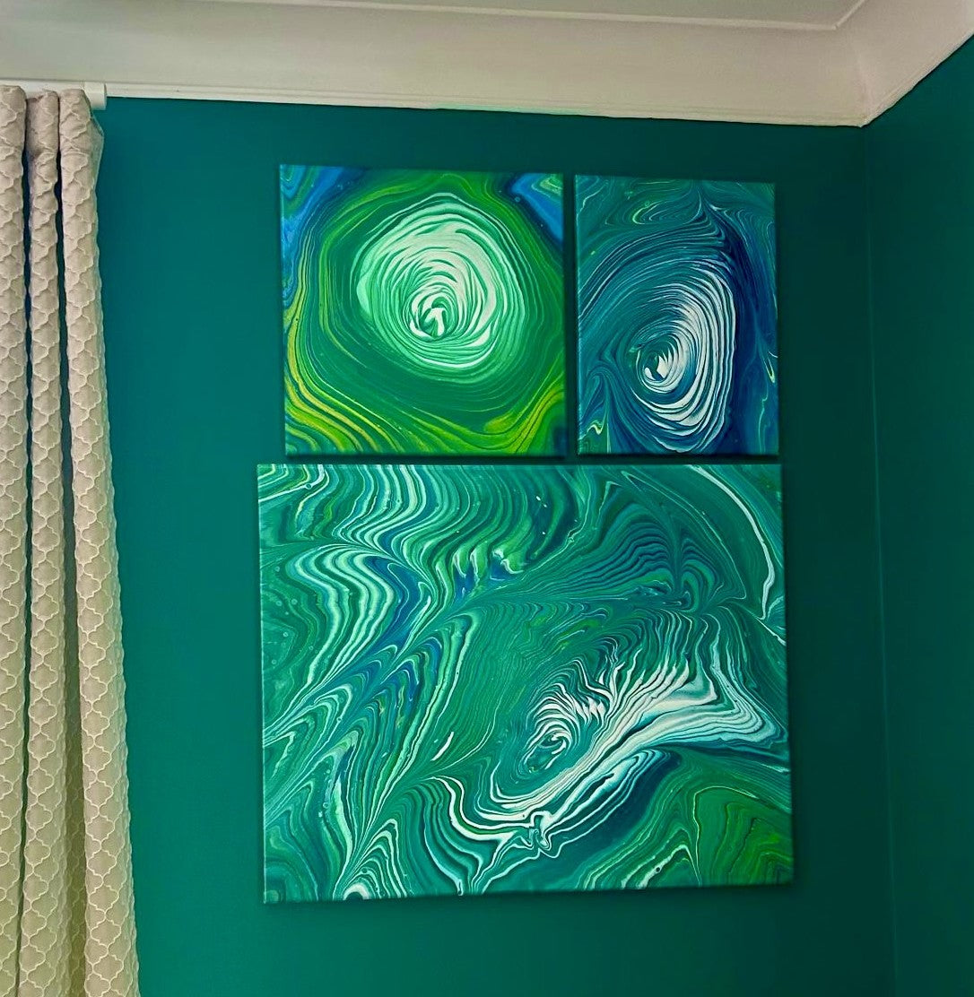 3 acrylic paintings using the same gorgeous greens and blues, each layered differently.