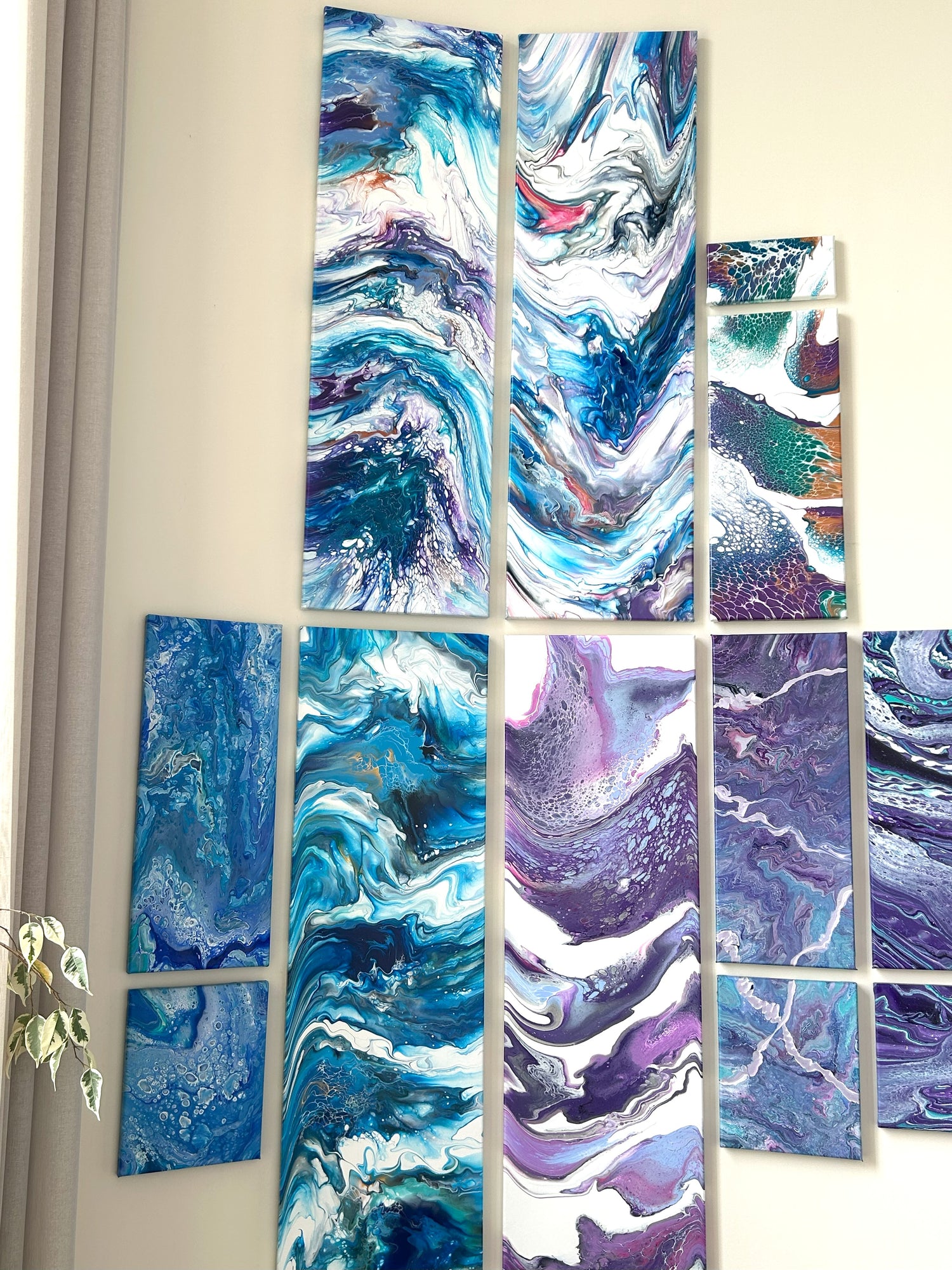 A wall of blue and purple canvases in various styles. Largest canvas shown 100 x 30 cm and smallest 10 x 20 cm.