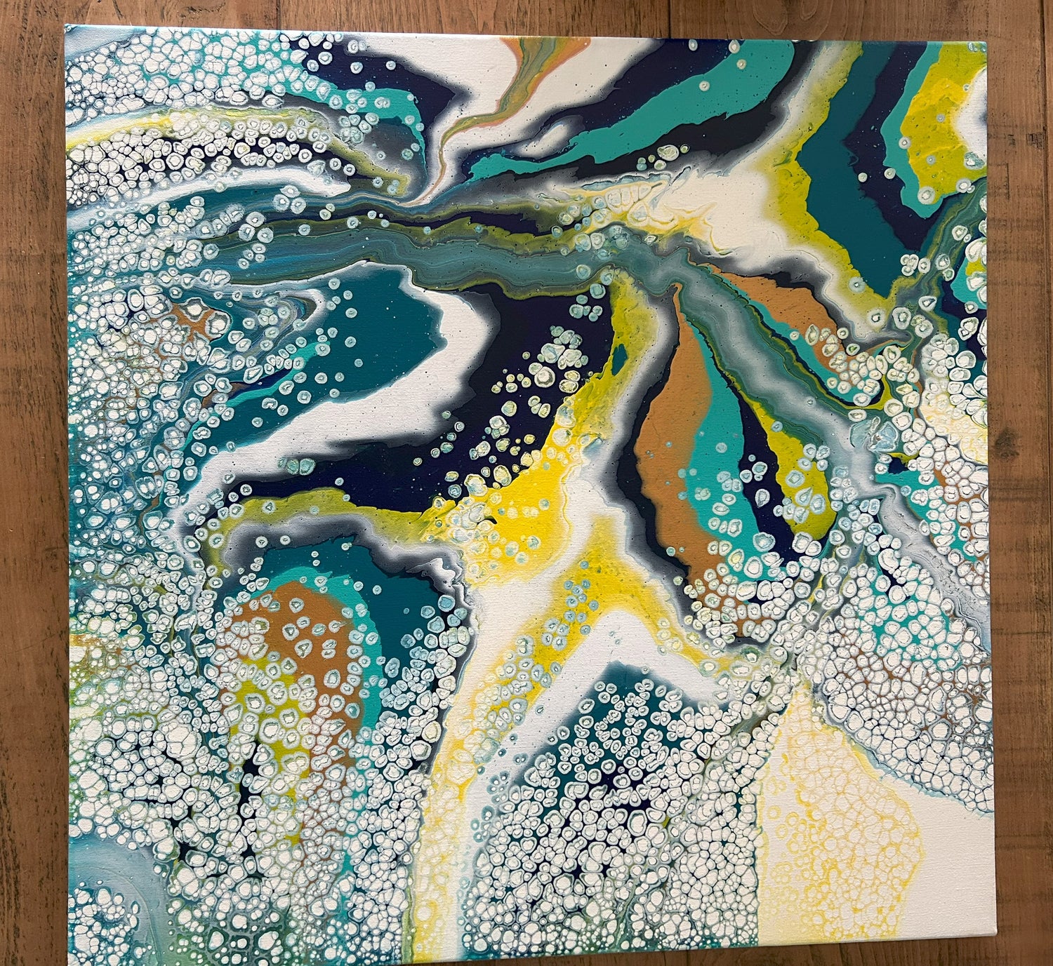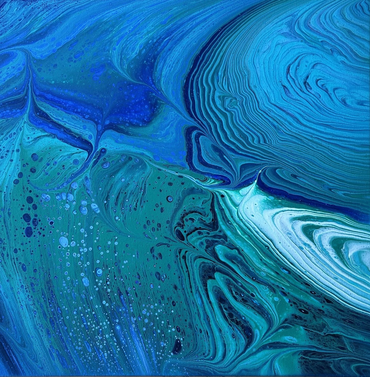 Original acrylic on canvas, 50cm x 50cm. Features a stunning combination of blue and green for intricate lines and cells.