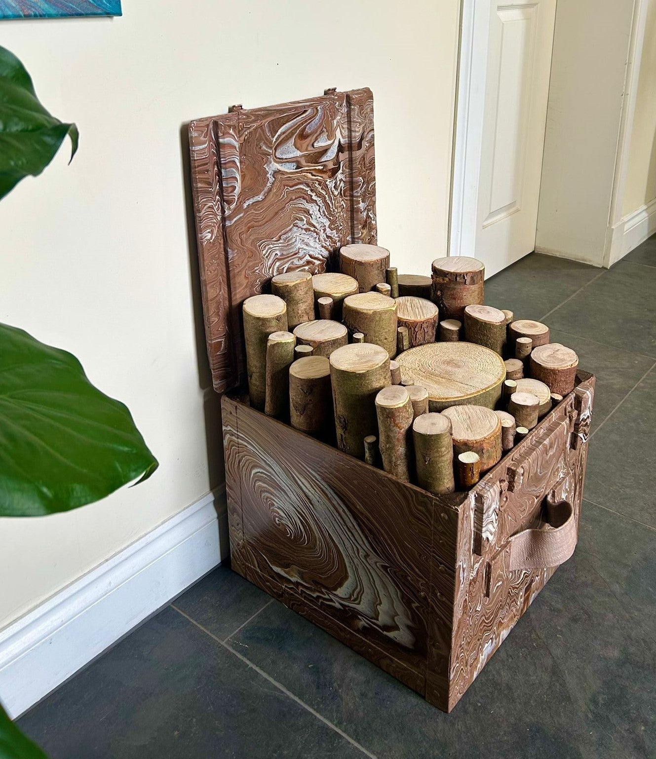 A refurbished WW1 ammunition box given a new lease of life, storing some wood.
