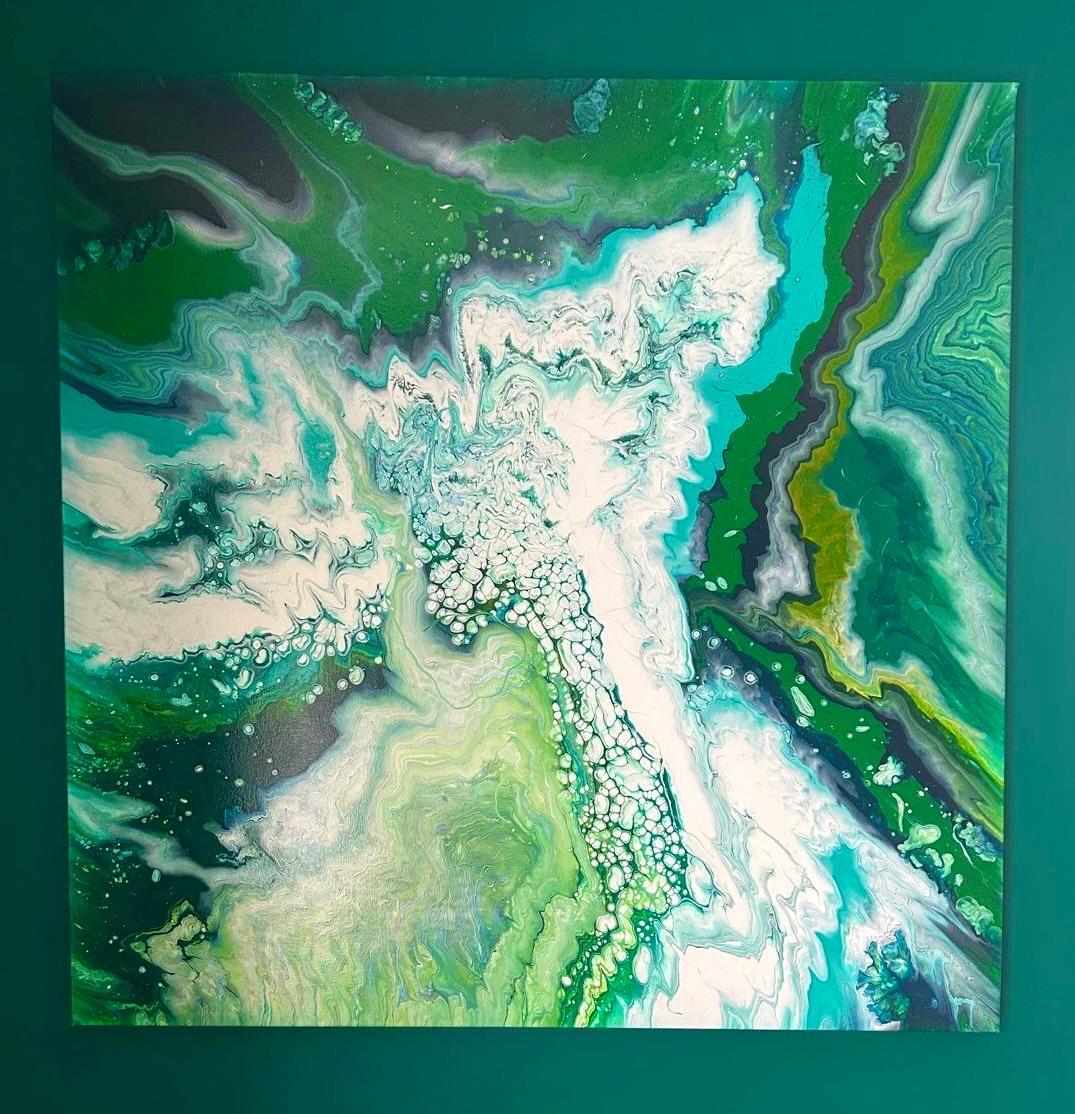 This original acrylic painting on a 100 cm by 100 cm deep edge canvas draws inspiration from the stunning colors of the Amazon, offering a striking centerpiece that enhances any room with its vivid presence.