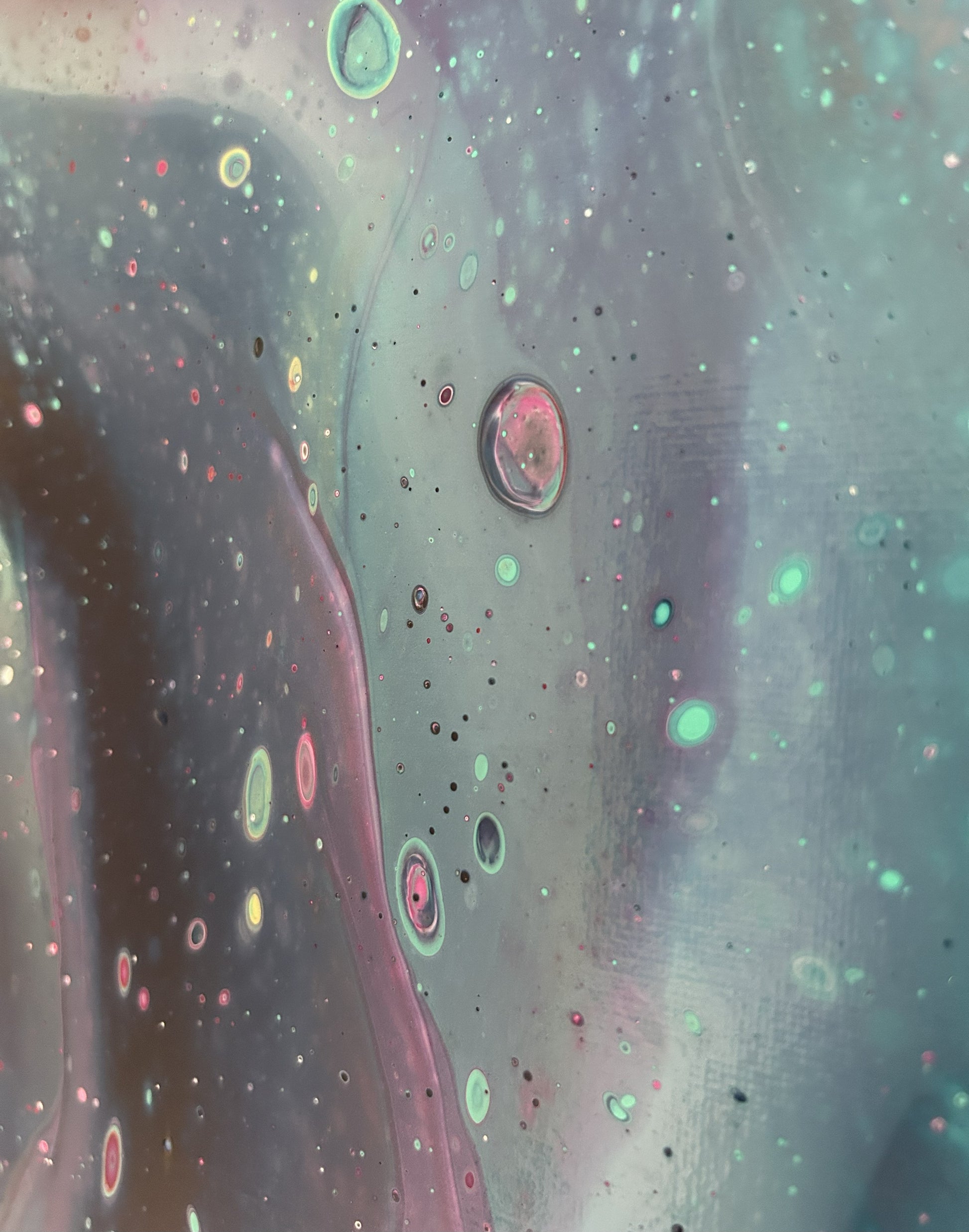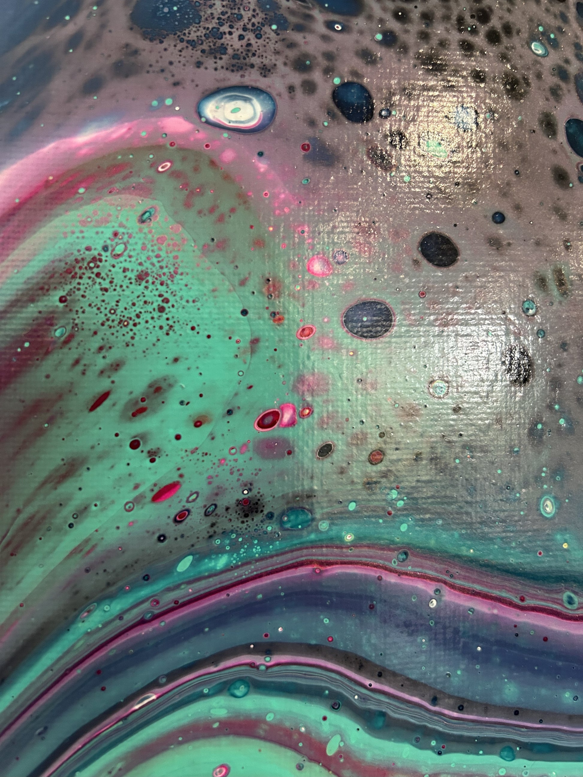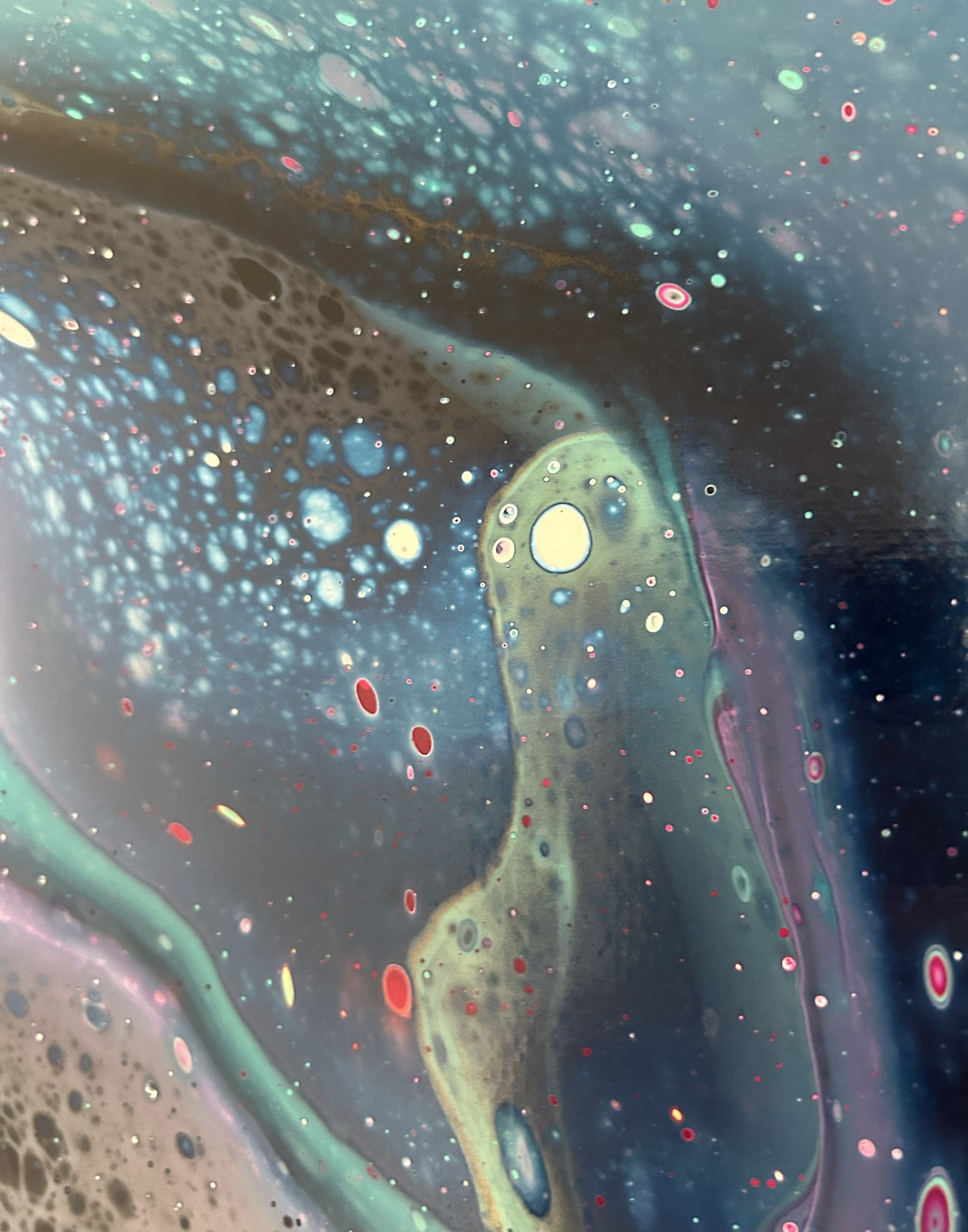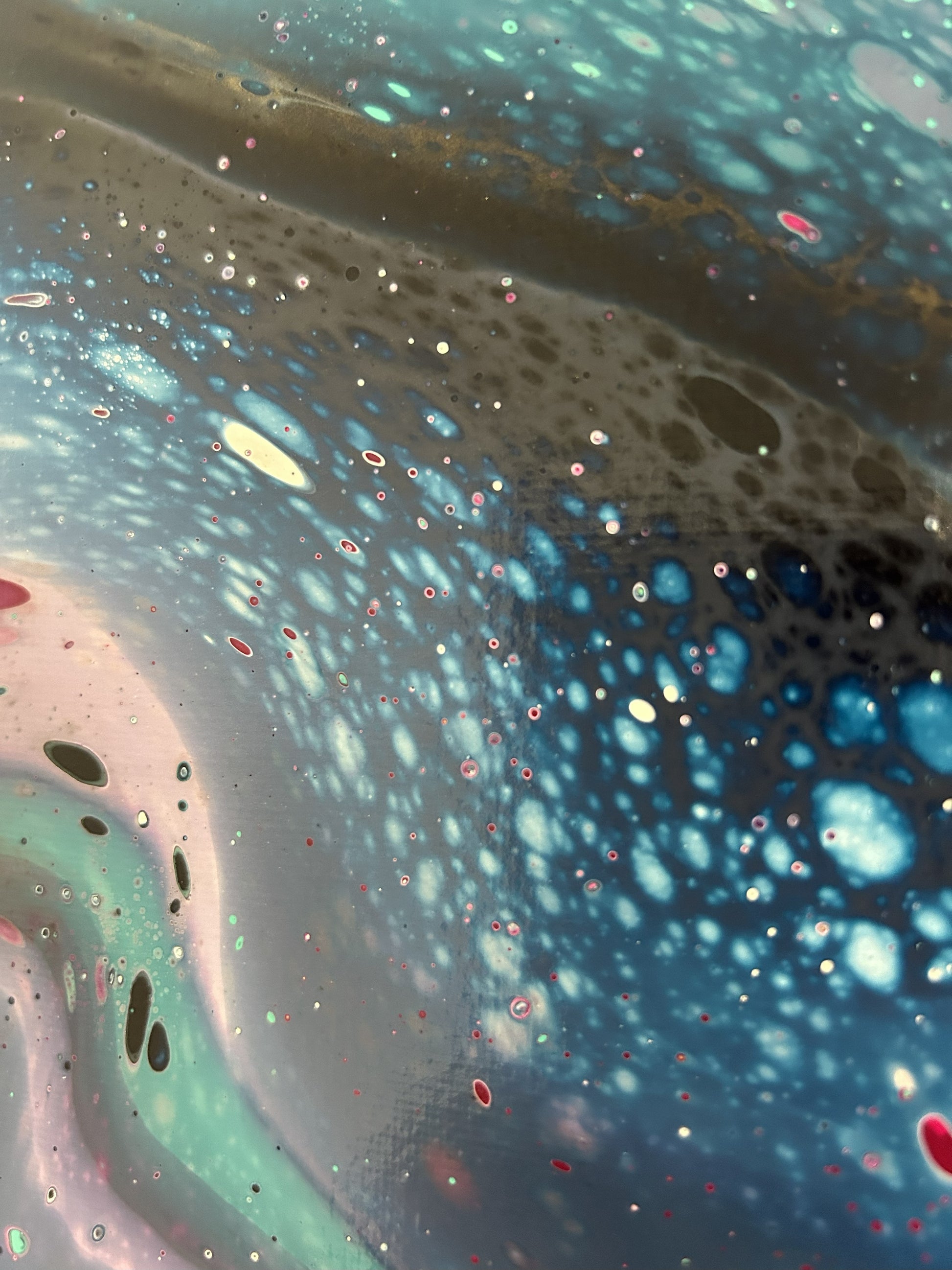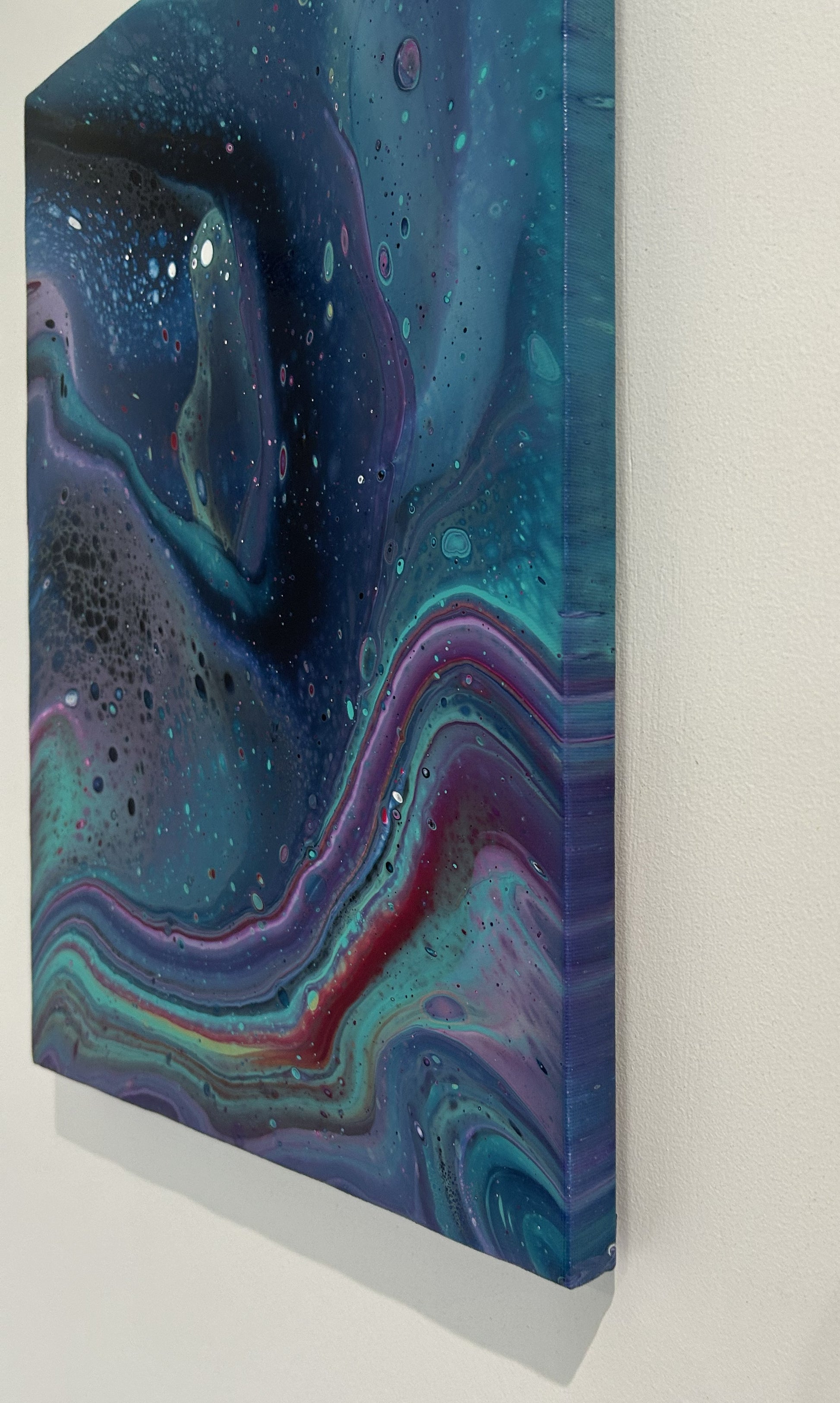 A rainbow wave crests across this piece, creating drama amongst the deep blues.