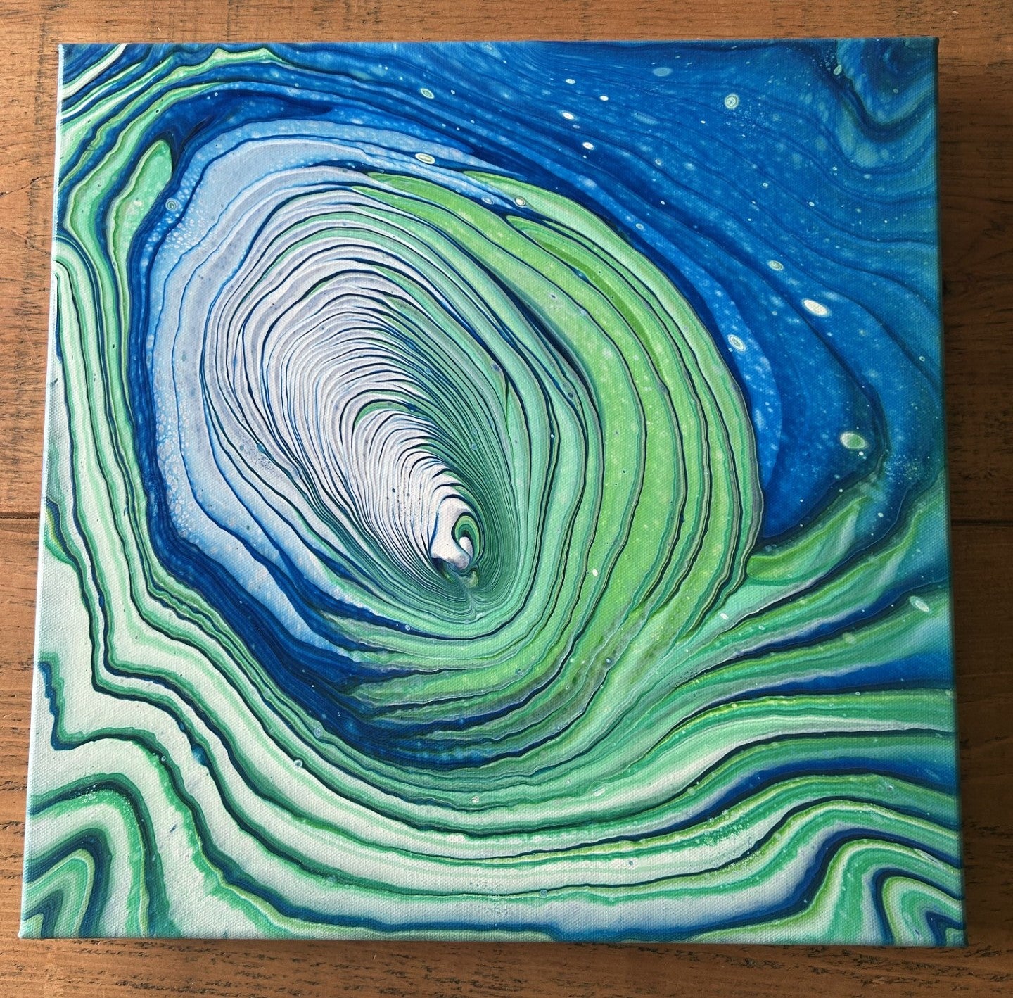 This original acrylic artwork, measuring 40 cm by 40 cm, features a captivating blend of rich green hues and soothing warm blues, creating a truly mesmerizing visual experience.