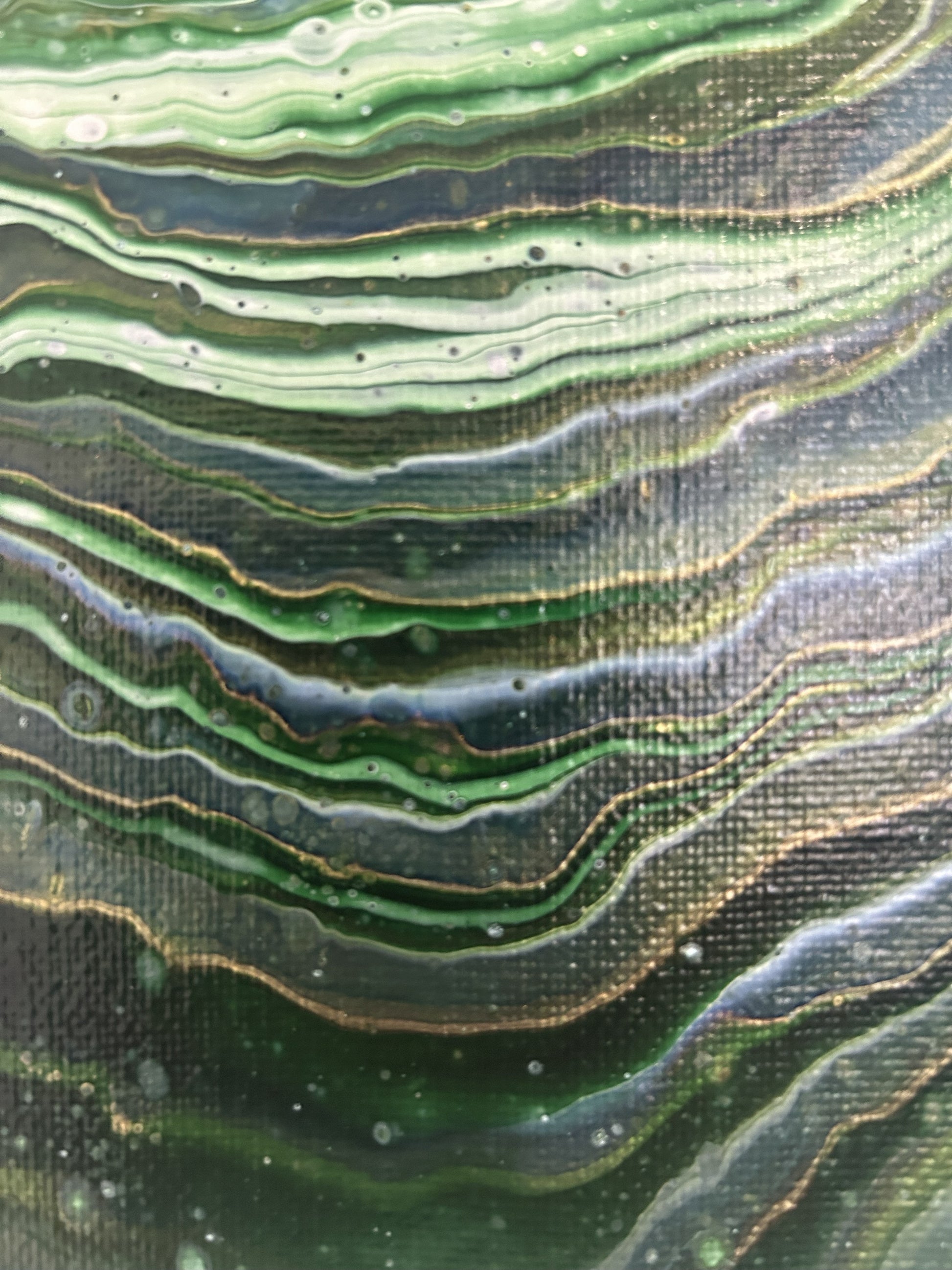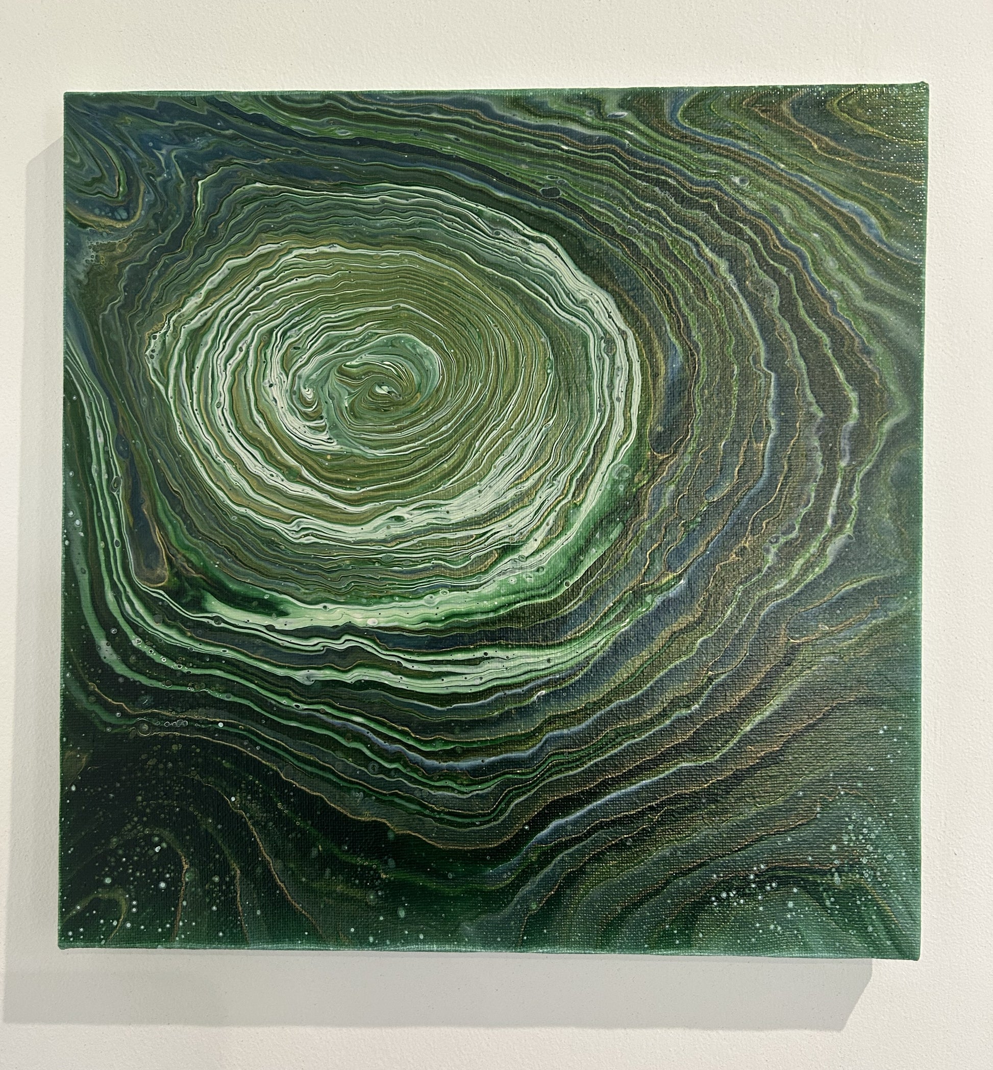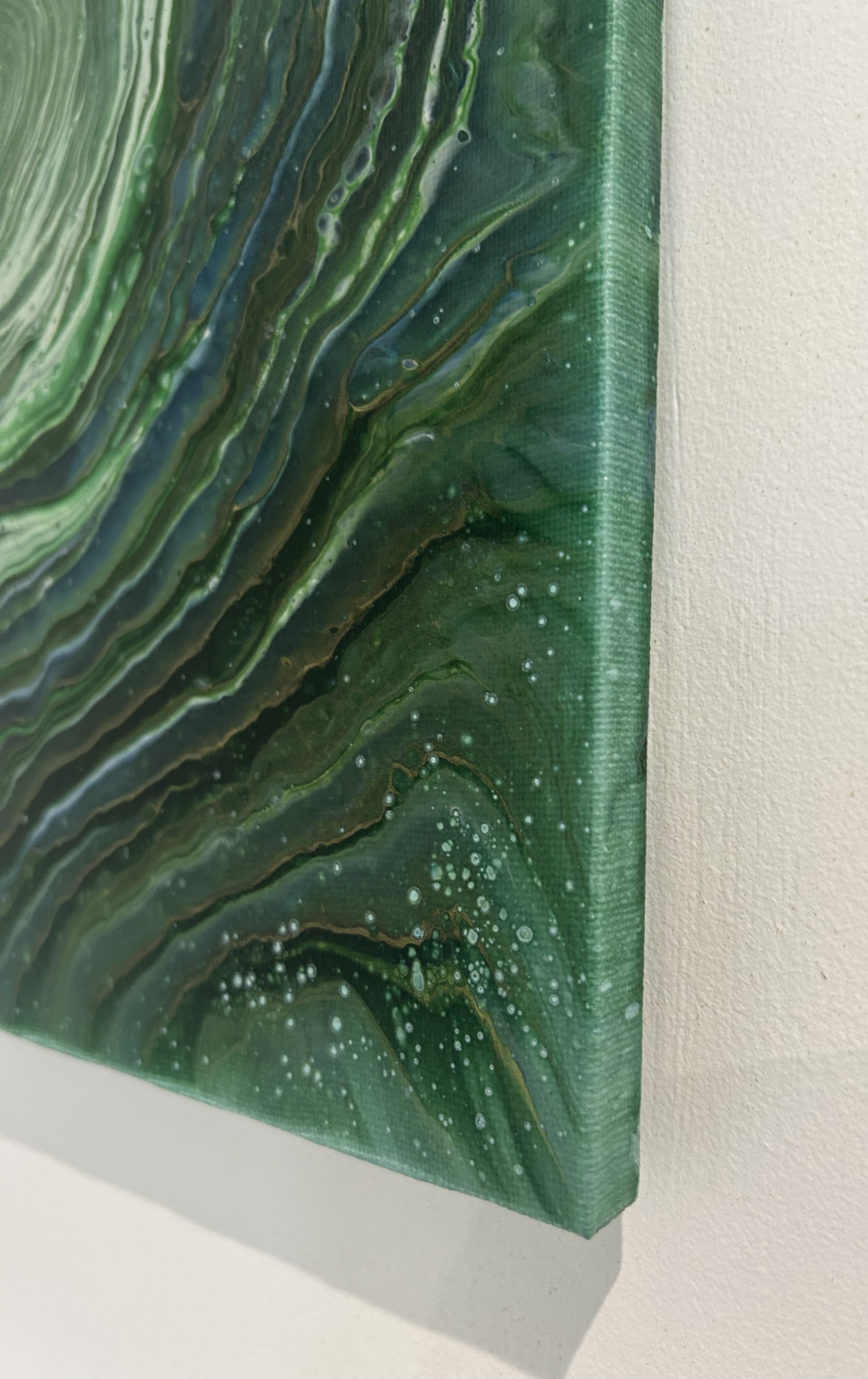 A serene blend of greens, akin to Scotlands forests and hills. This piece draws you in from the rich dark shades to the softer centre.