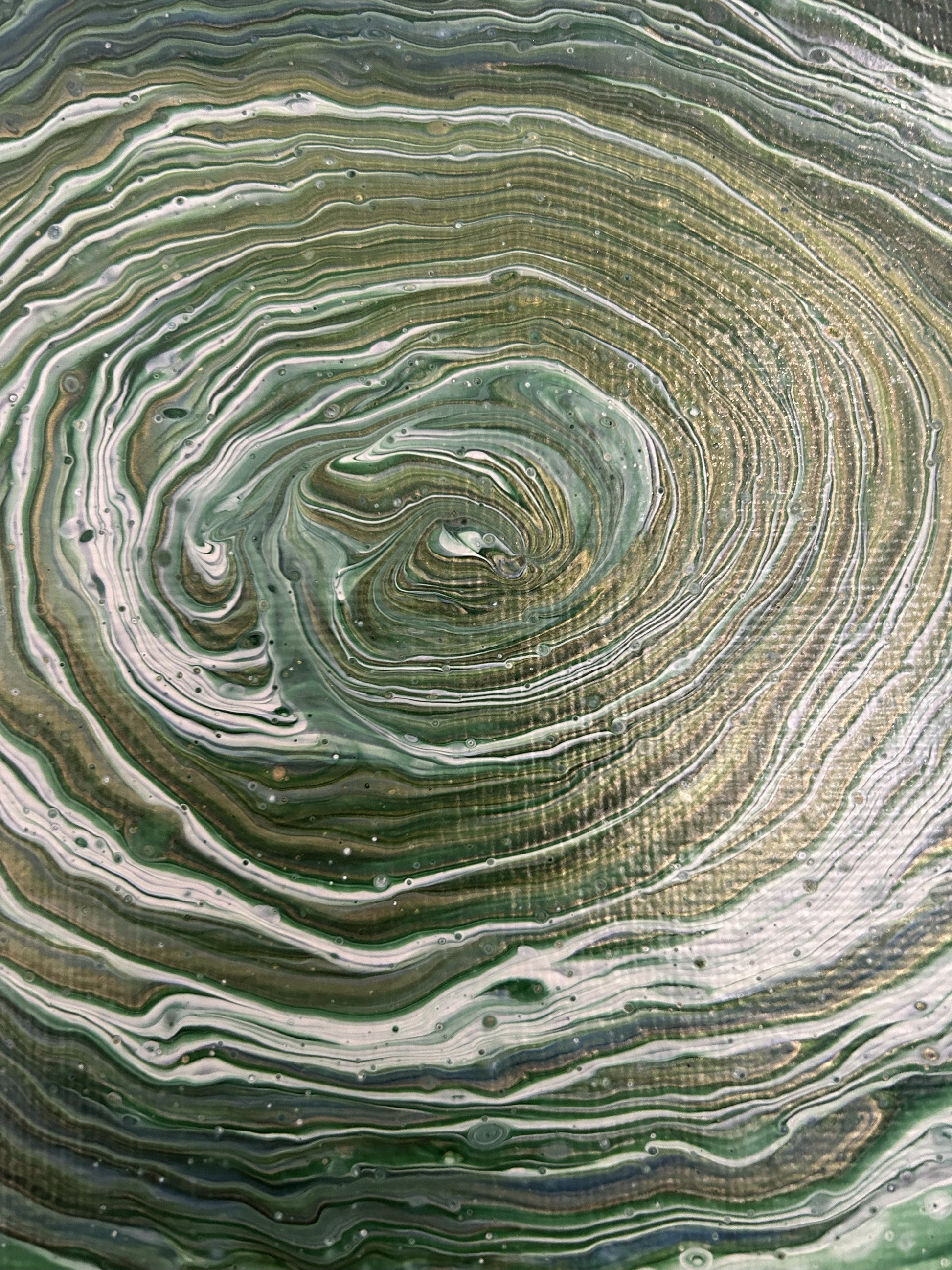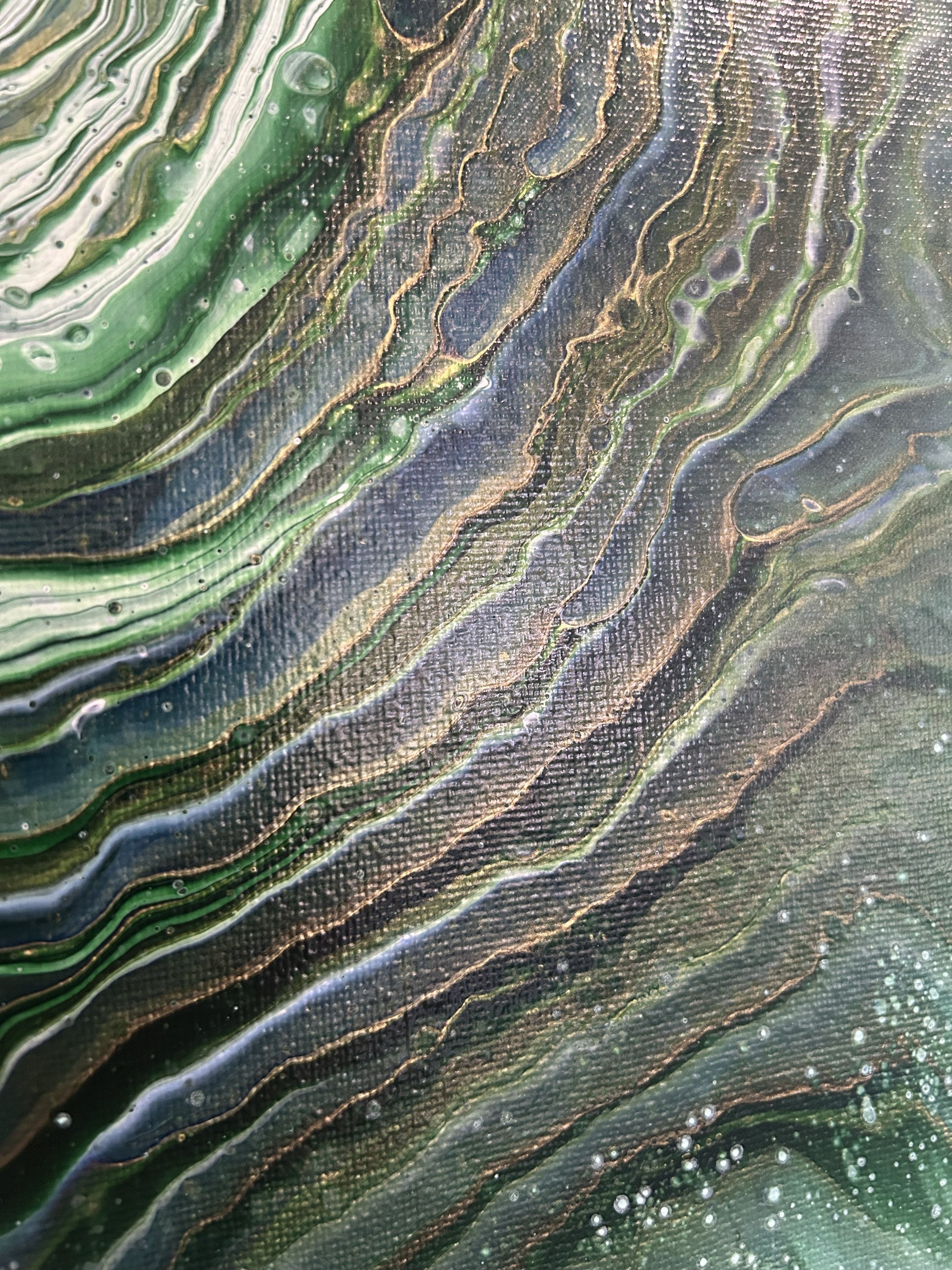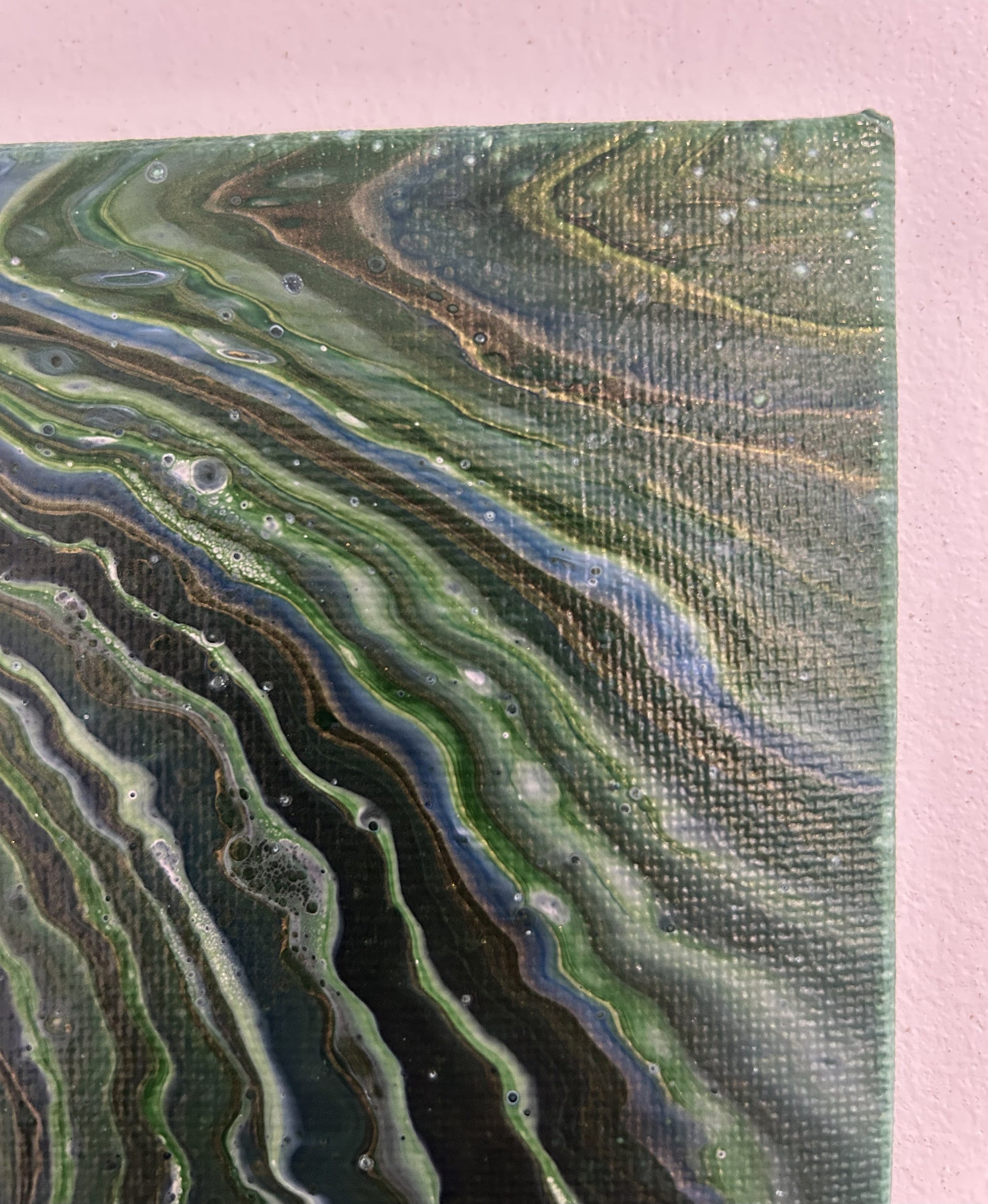 A serene blend of greens, akin to Scotlands forests and hills. This piece draws you in from the rich dark shades to the softer centre.