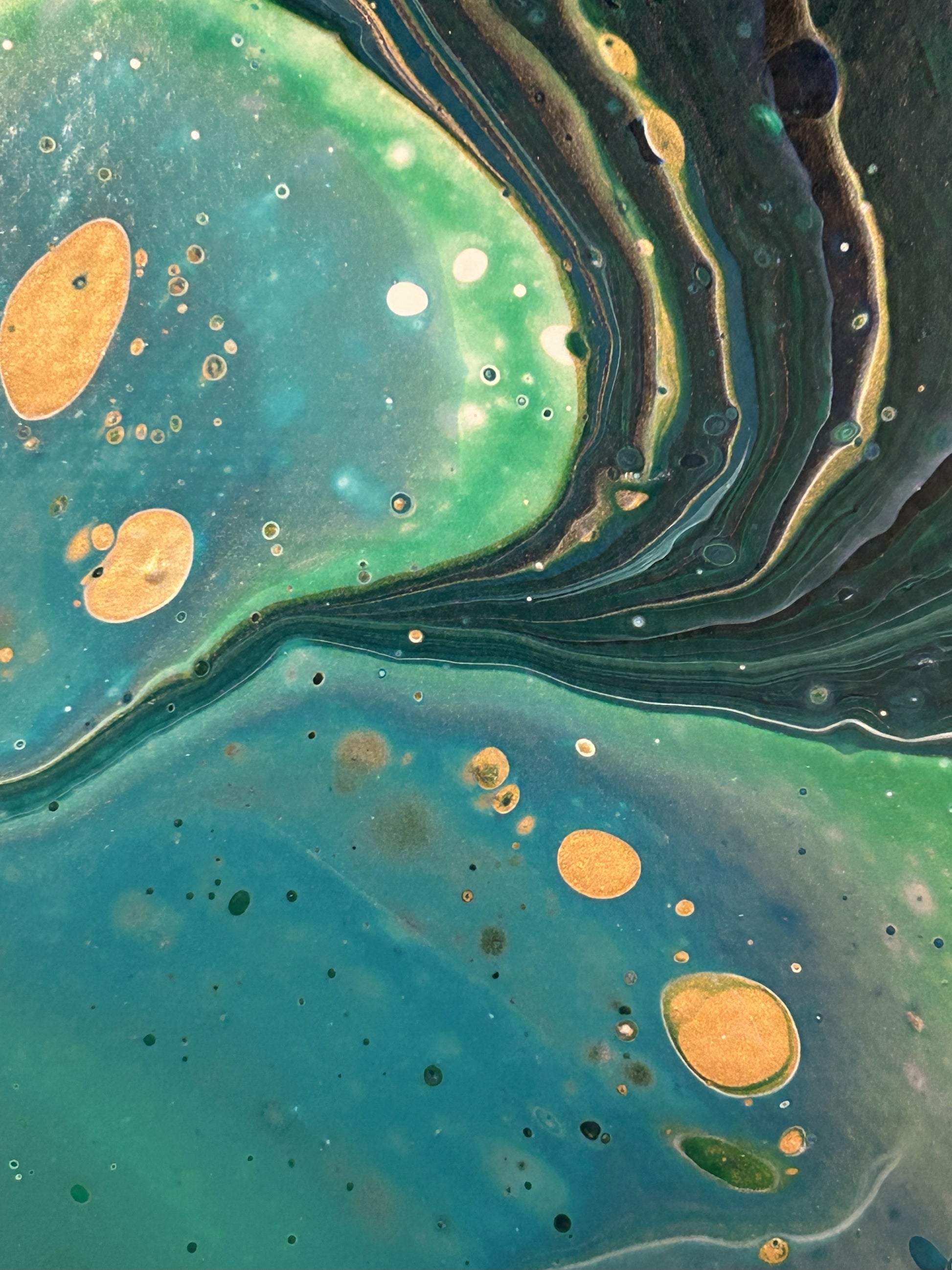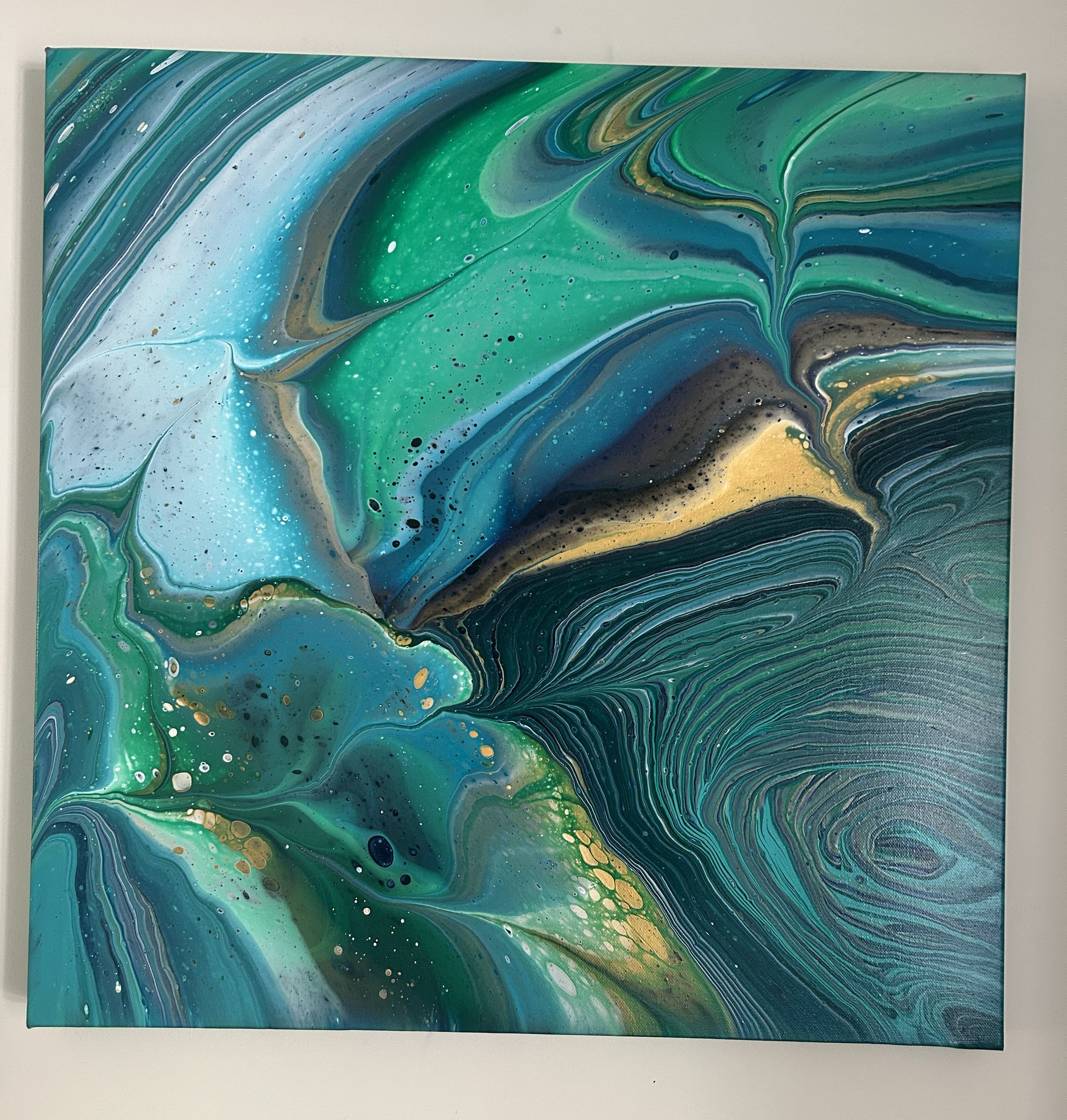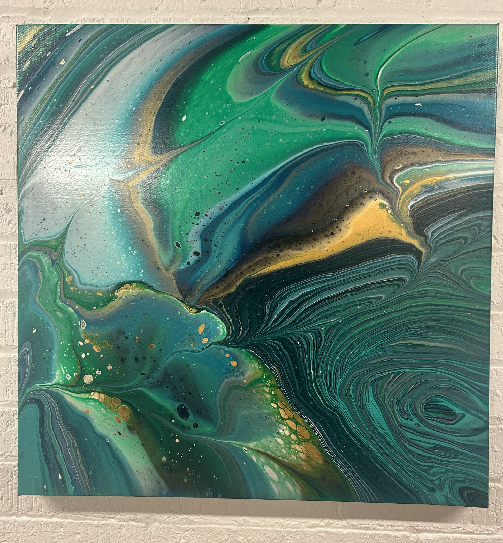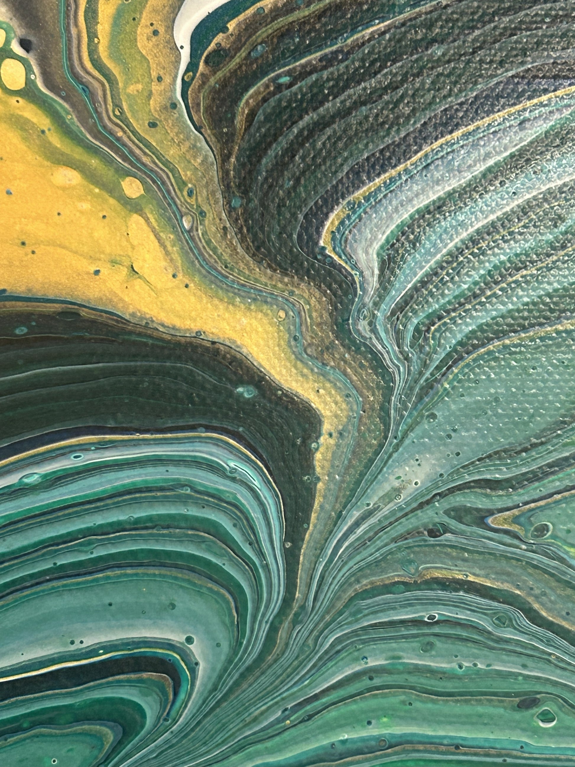Stunning lines and details in this piece full of rich greens, blues and gold.
