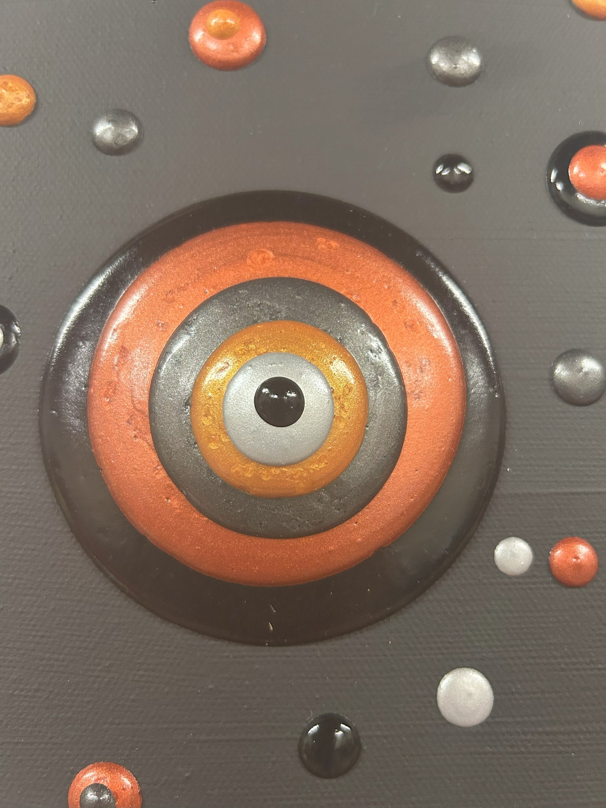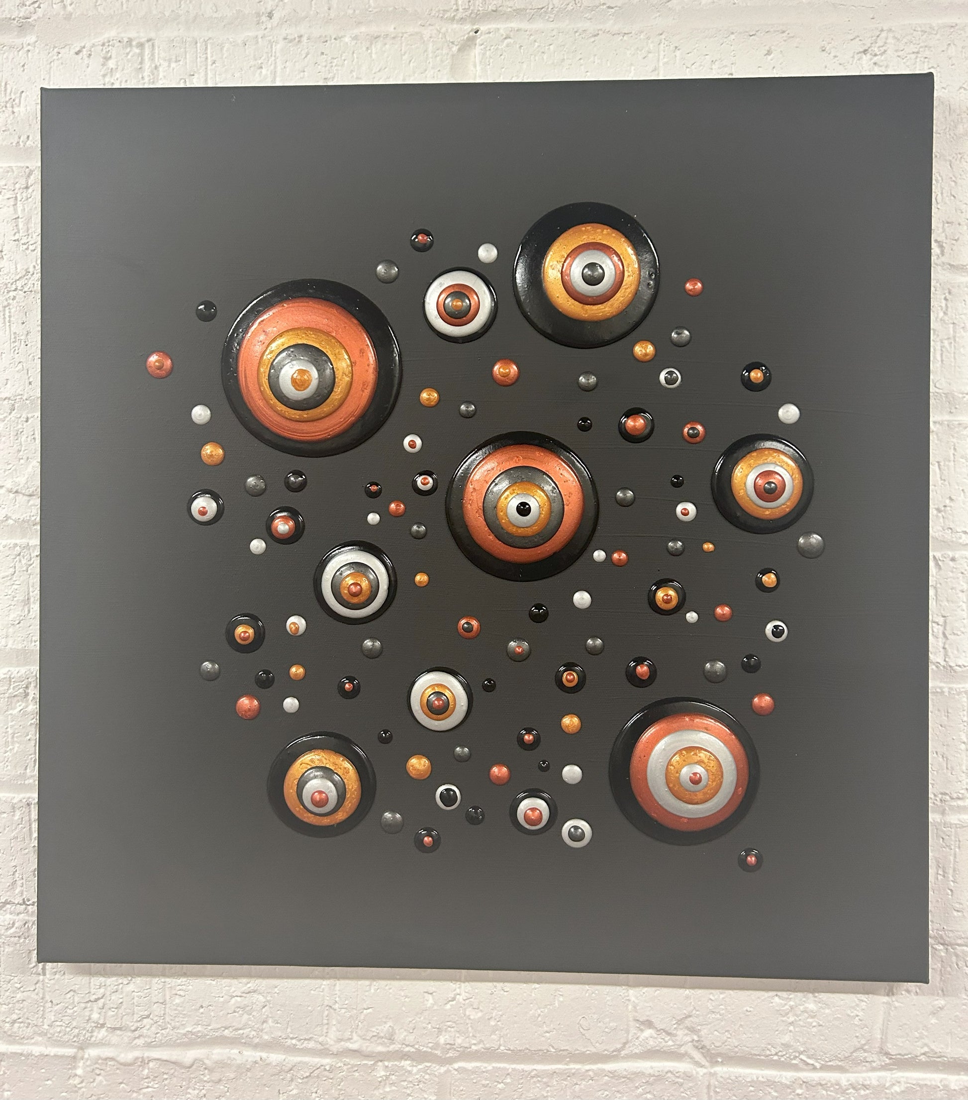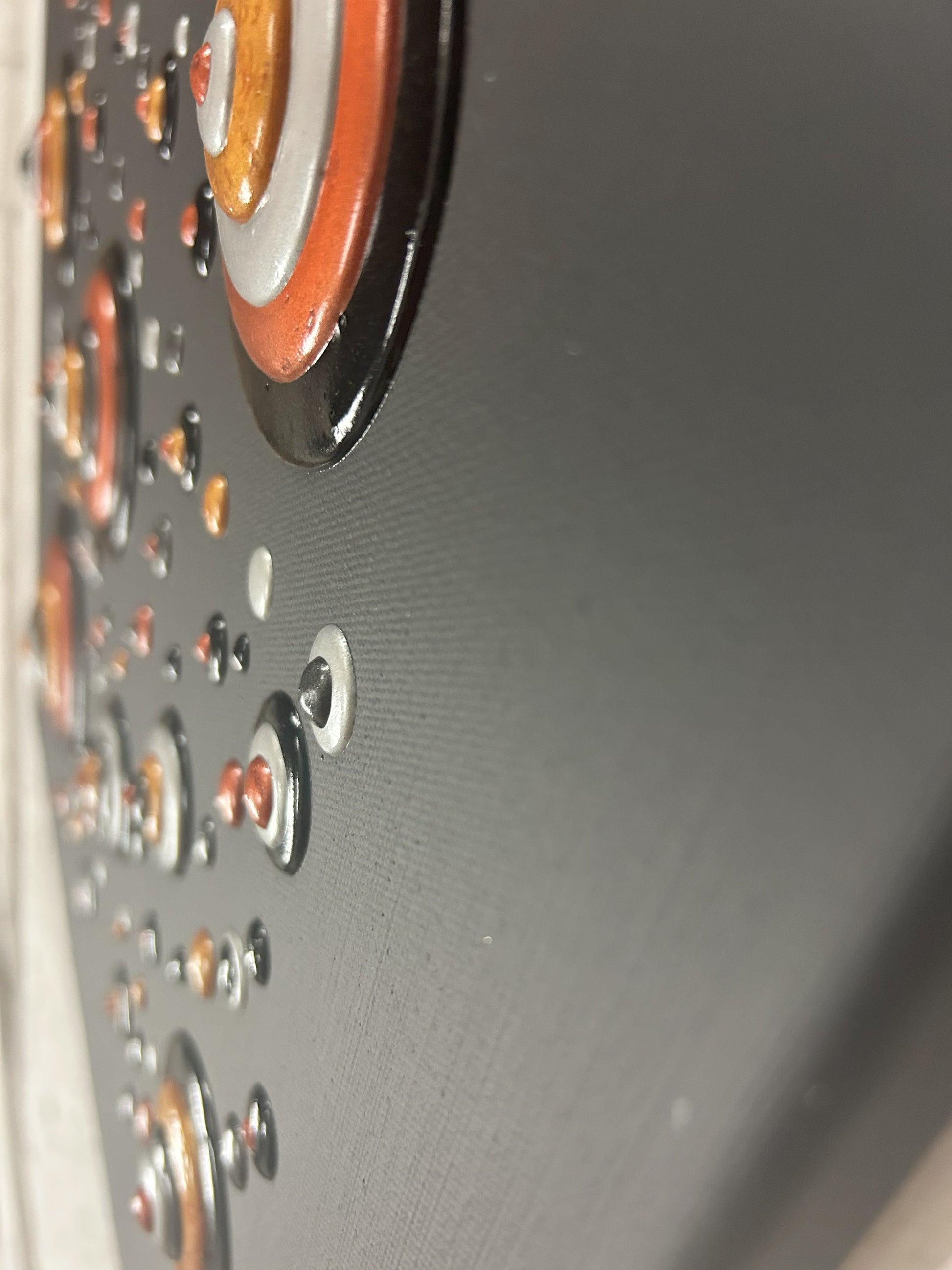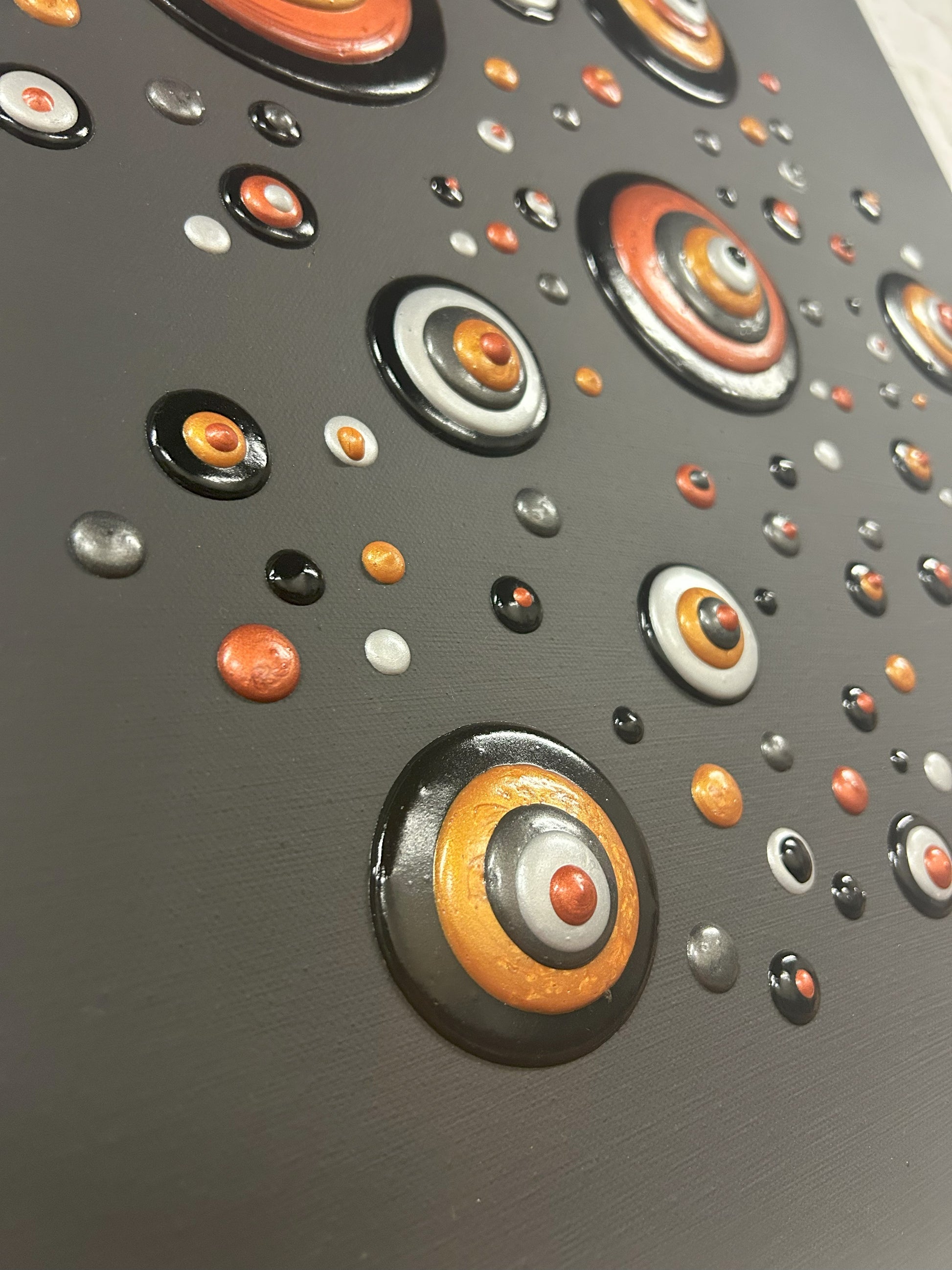 This contemporary 3D piece features metallic tones and black hues, expertly rendered in acrylic on a 50cm by 50cm canvas.