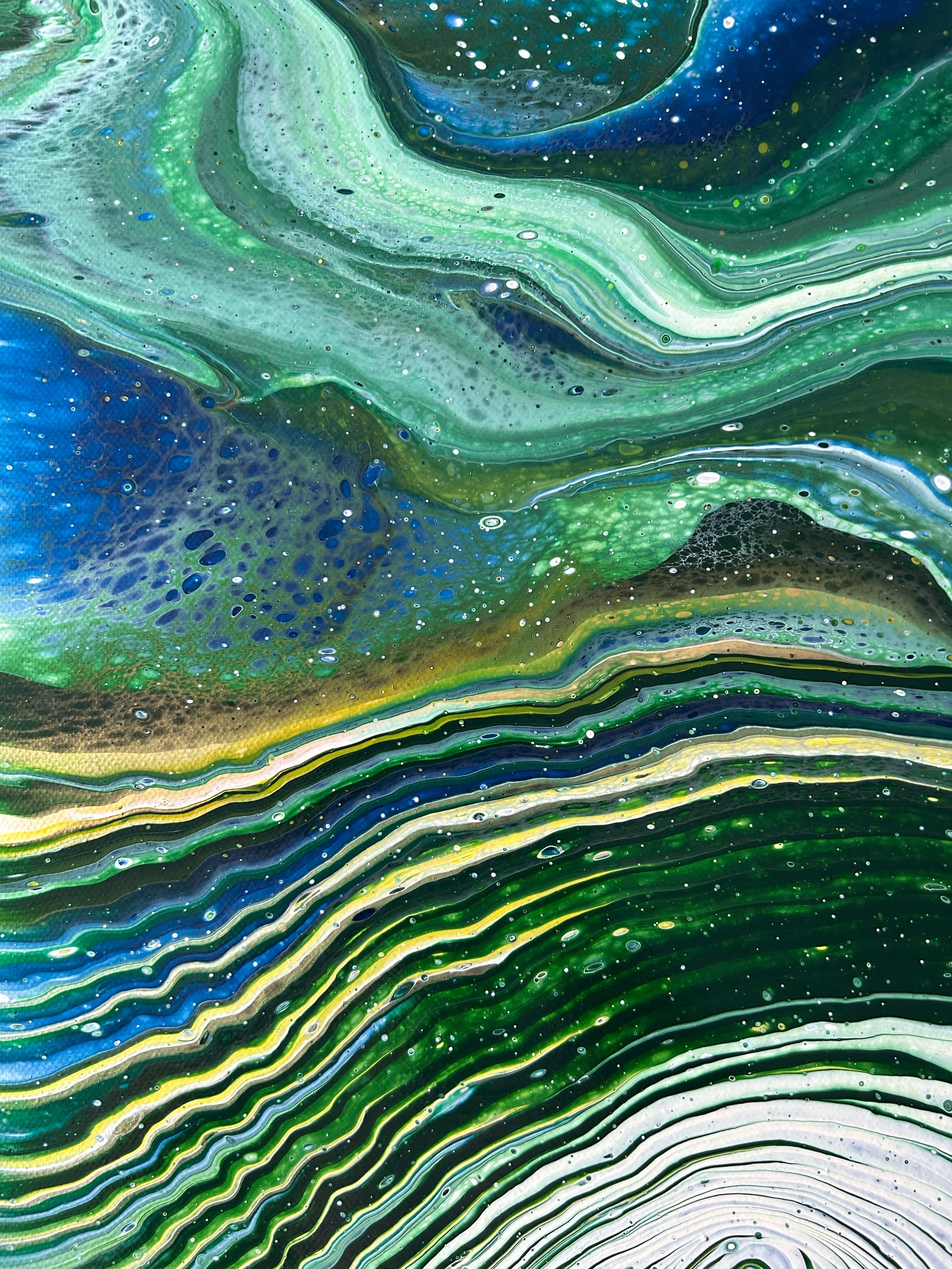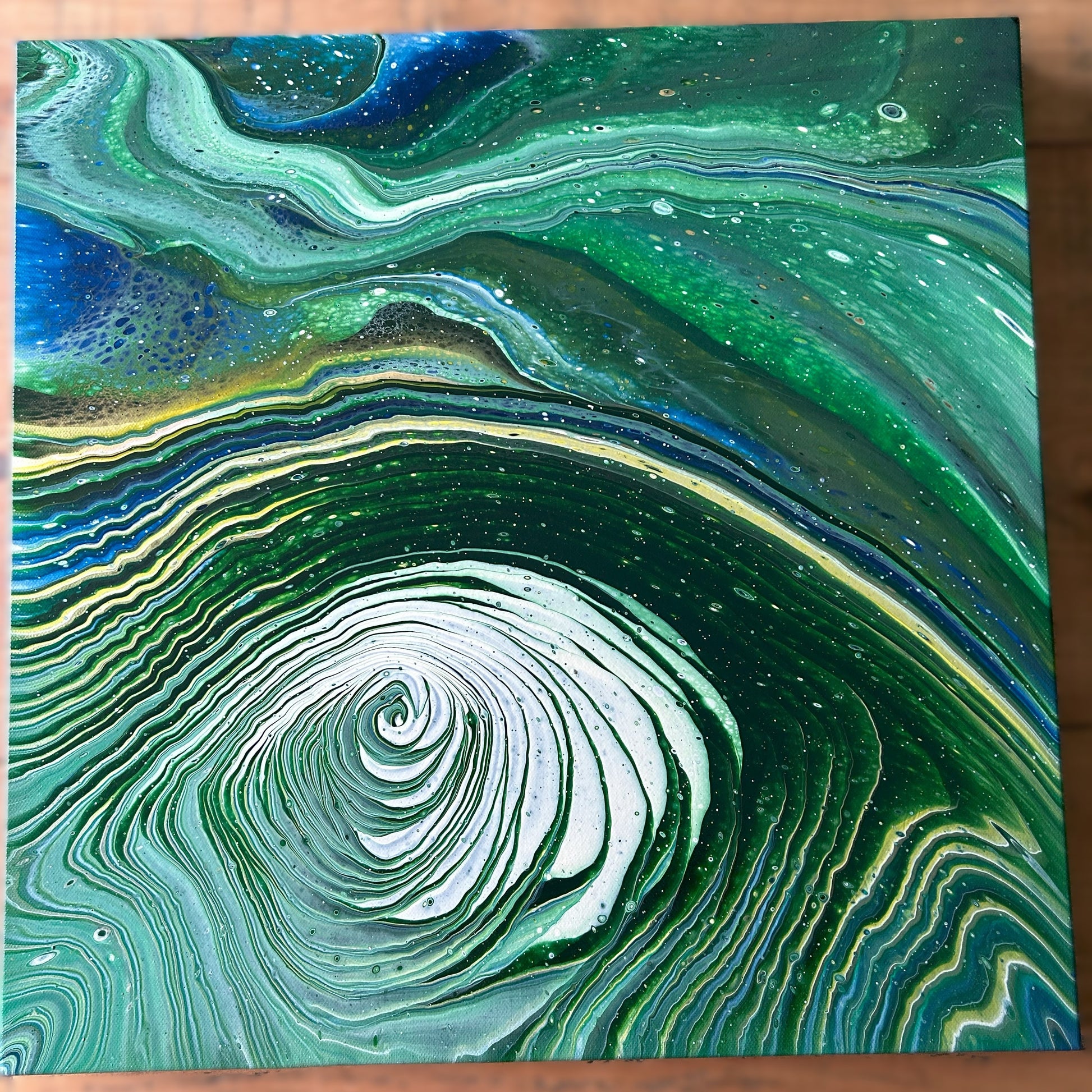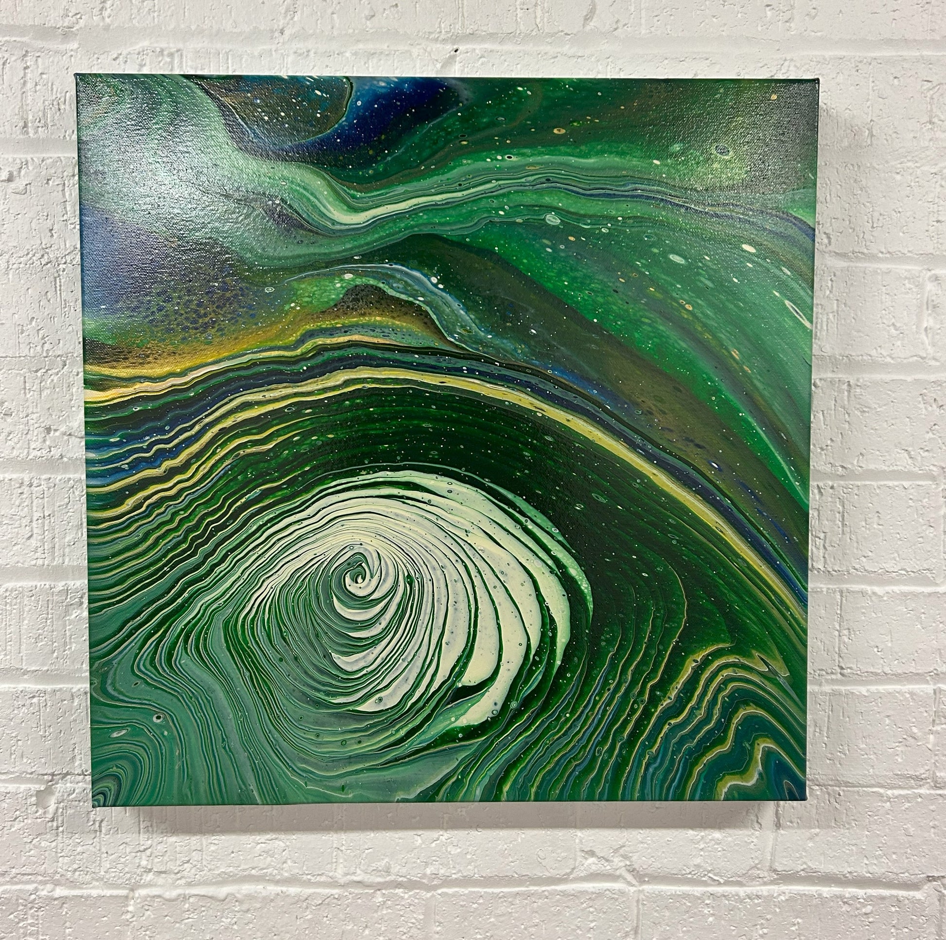 This original acrylic painting, presented on a 50cm by 50cm deep-edged canvas, showcases a captivating blend of sap green, blue, and gold tones that invite close observation and reflection.