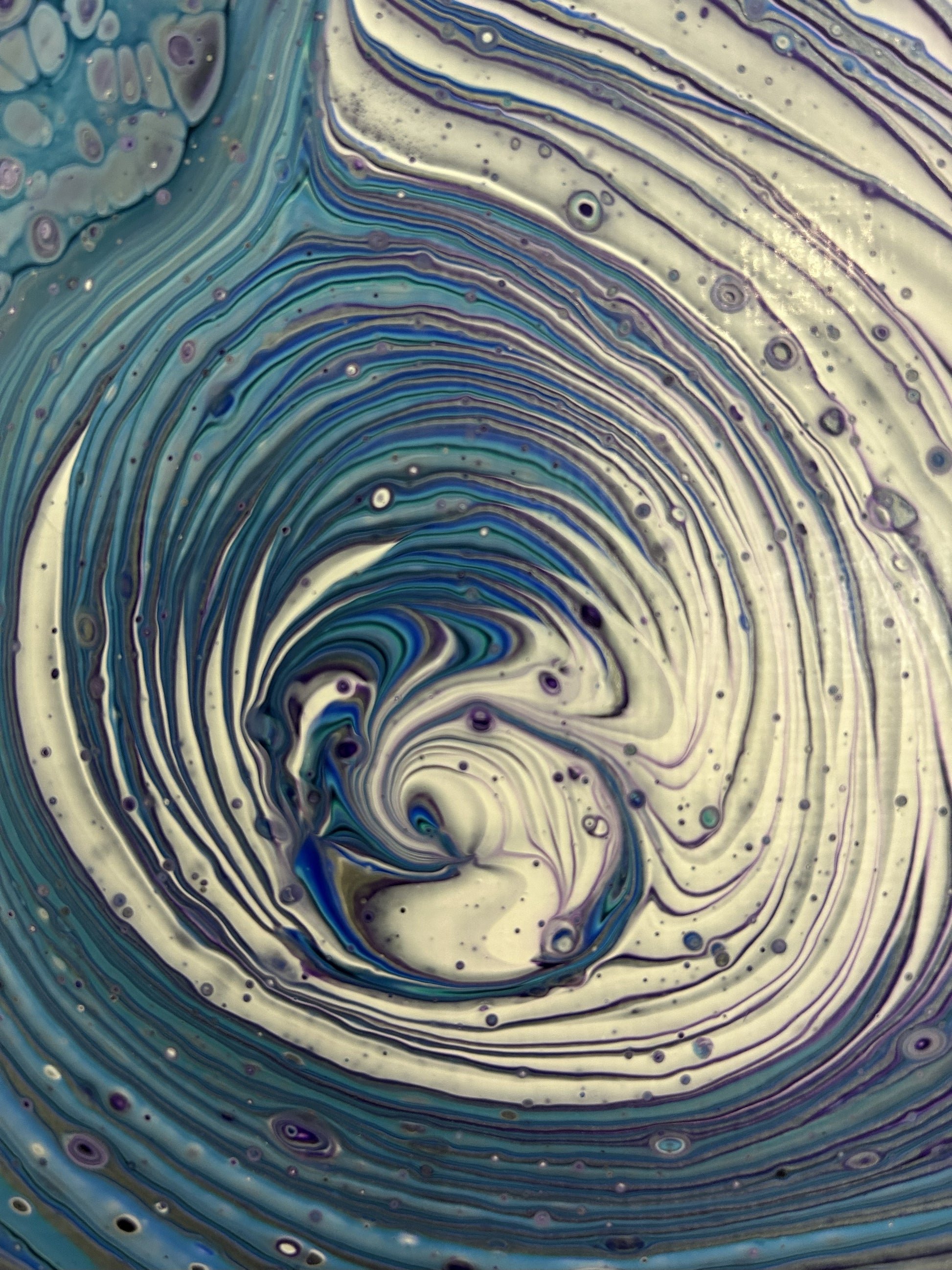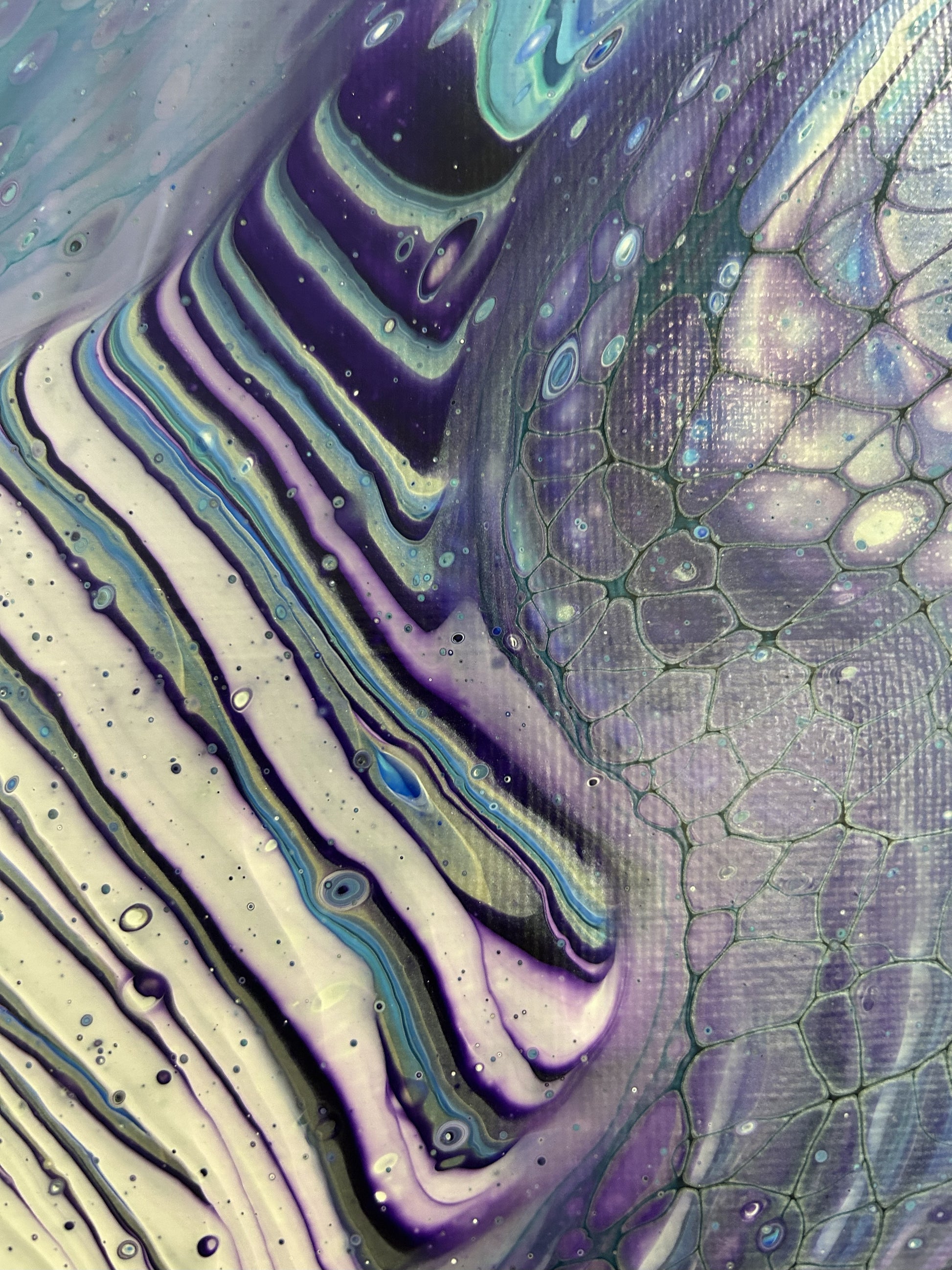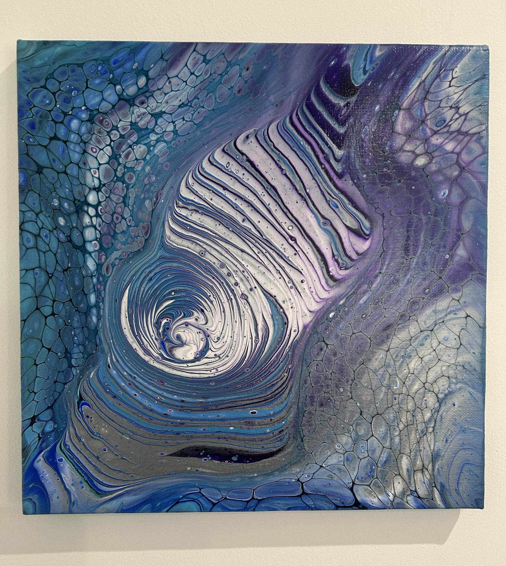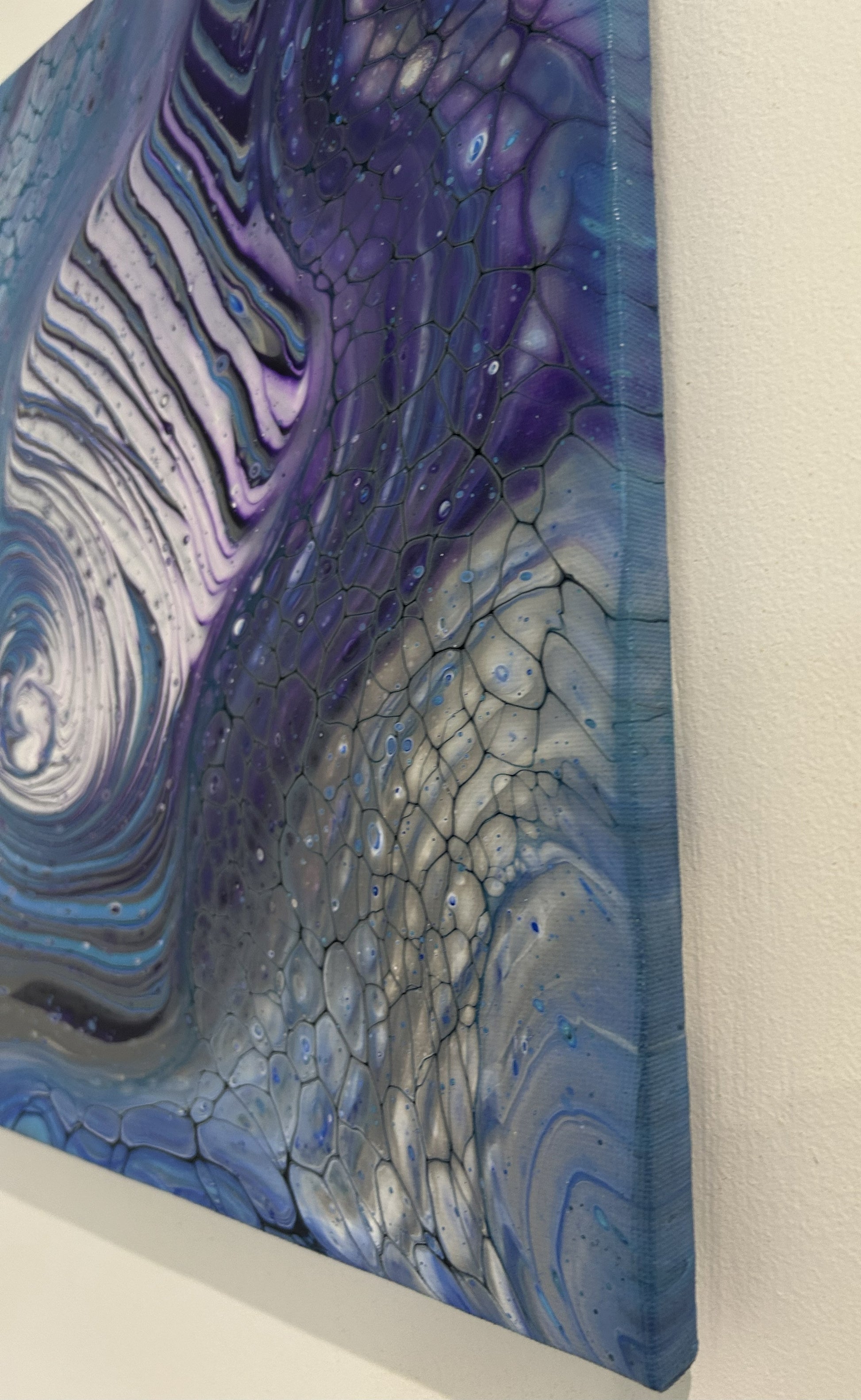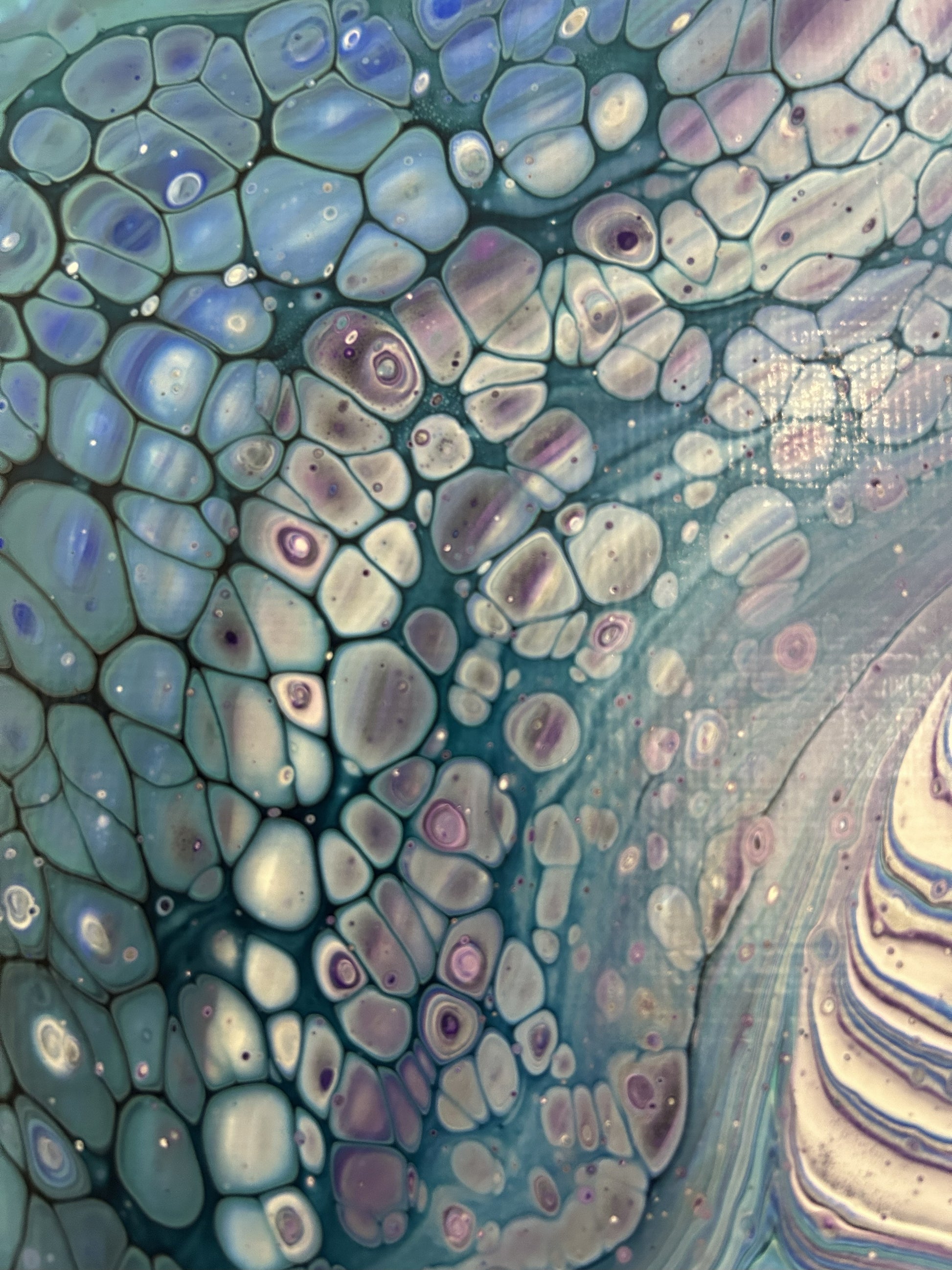 This piece with its soft blues, violets and silver creating cells and lacing, echoes the pebble filled beach I once lived next to in Argyll.