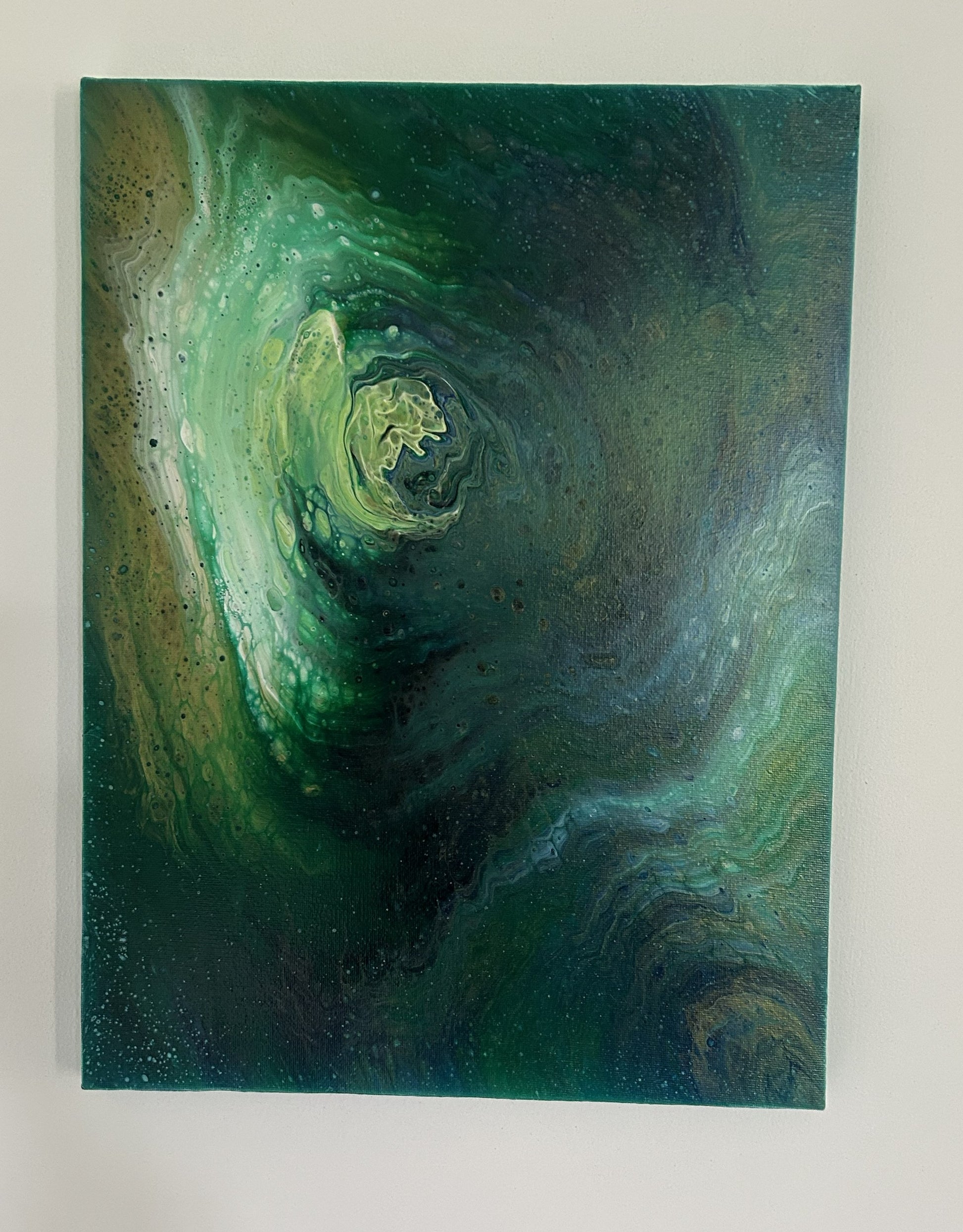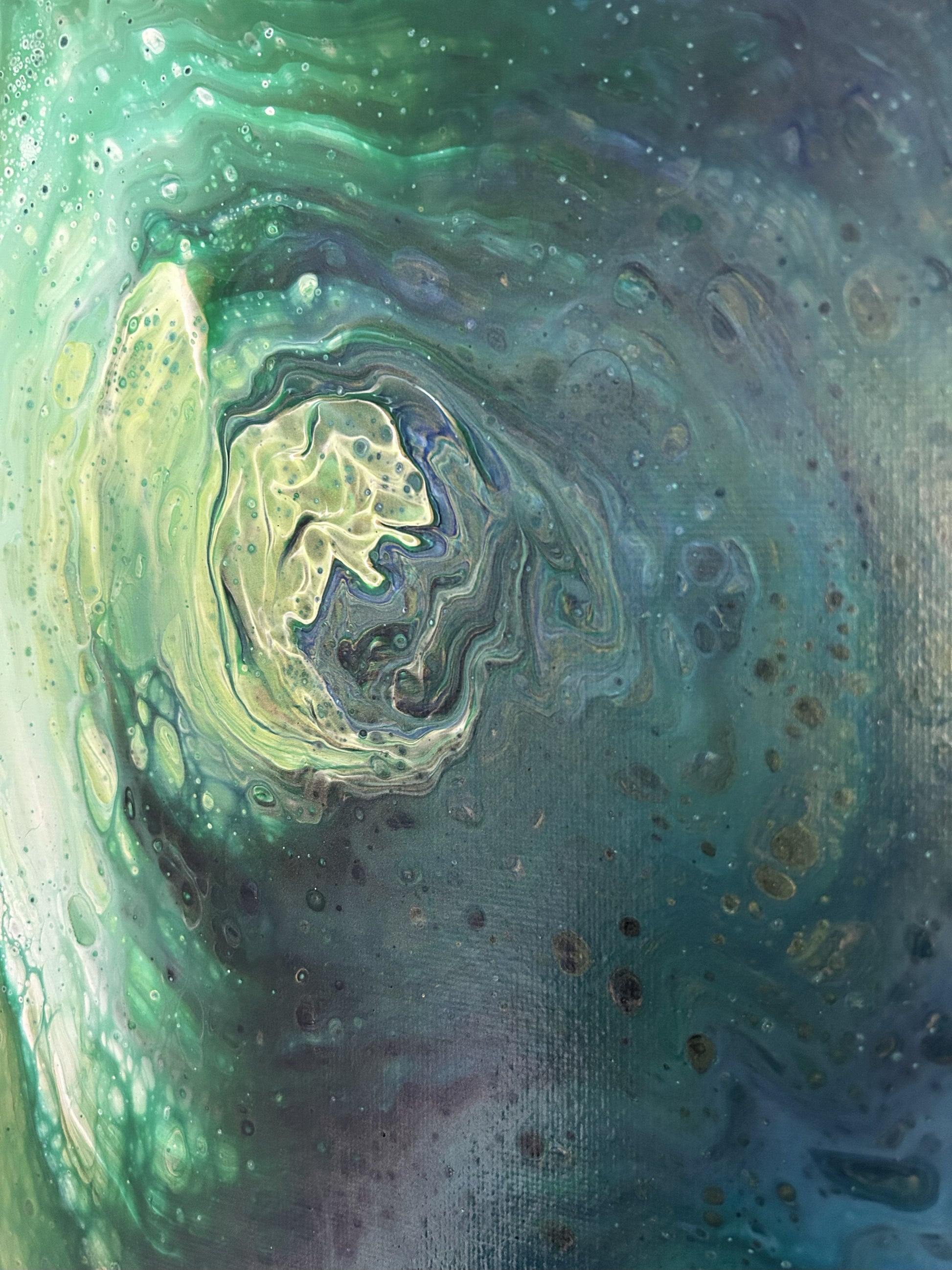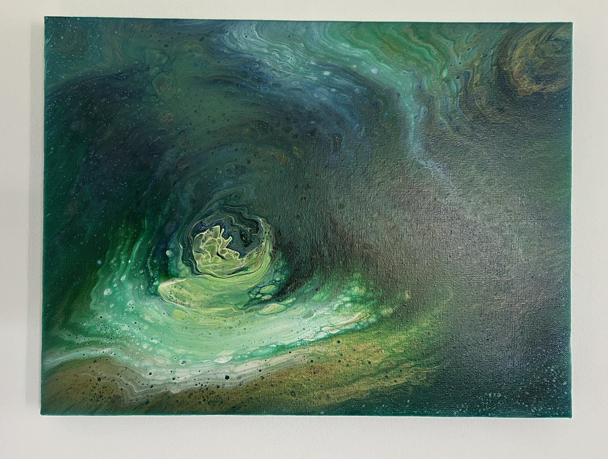 Greens, blues and golds blend gently in this piece, creating some soft details. This captivating painting draws you in.