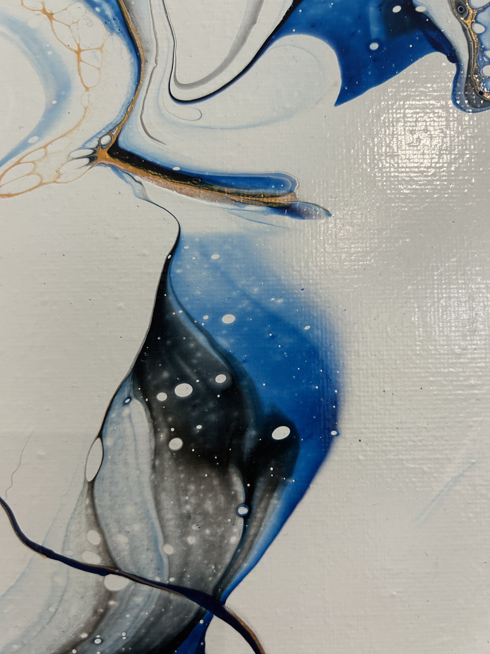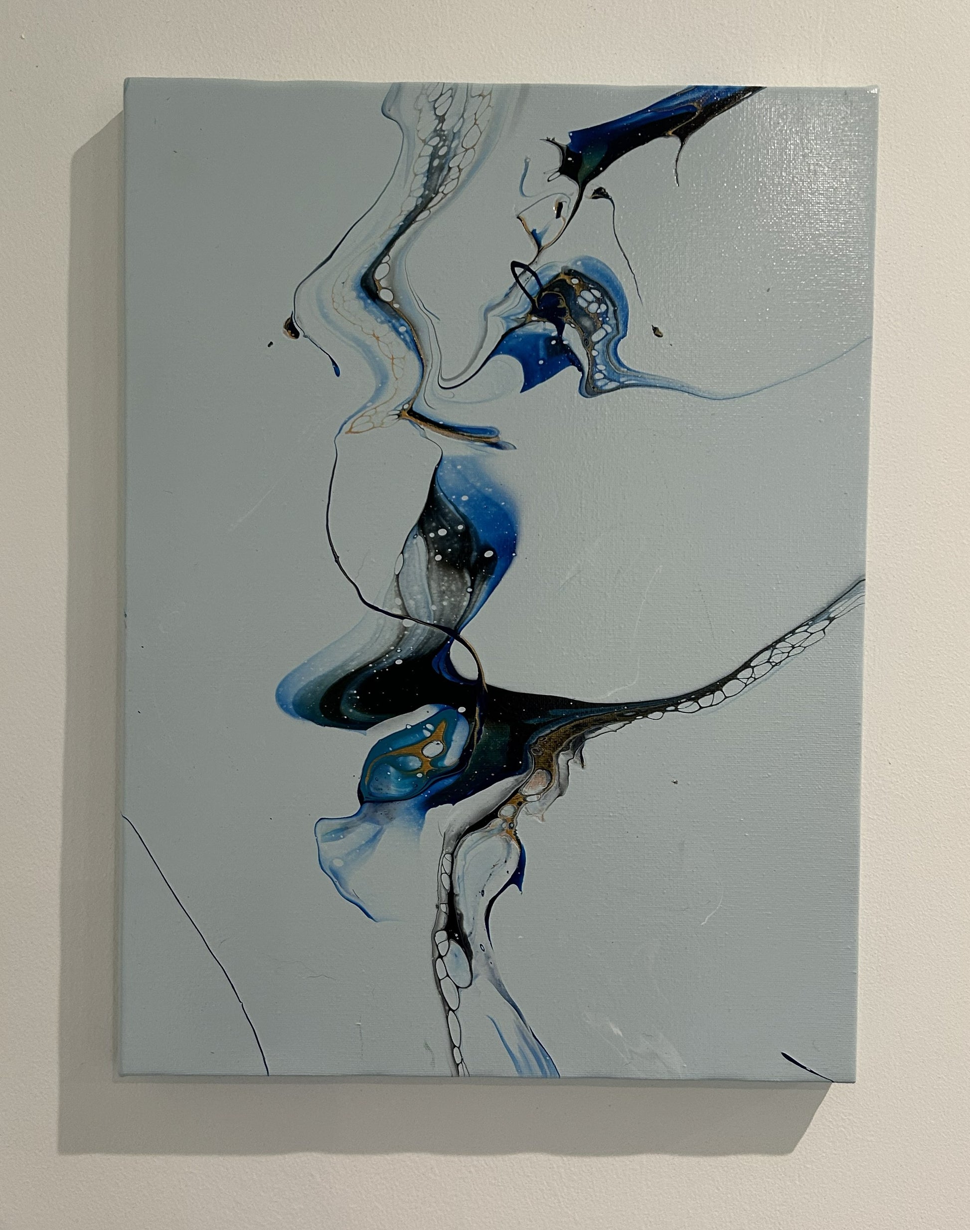 The palest of blues provides the negative space for this minimal piece, with rich blues, gold and black giving the cells, lines and details.