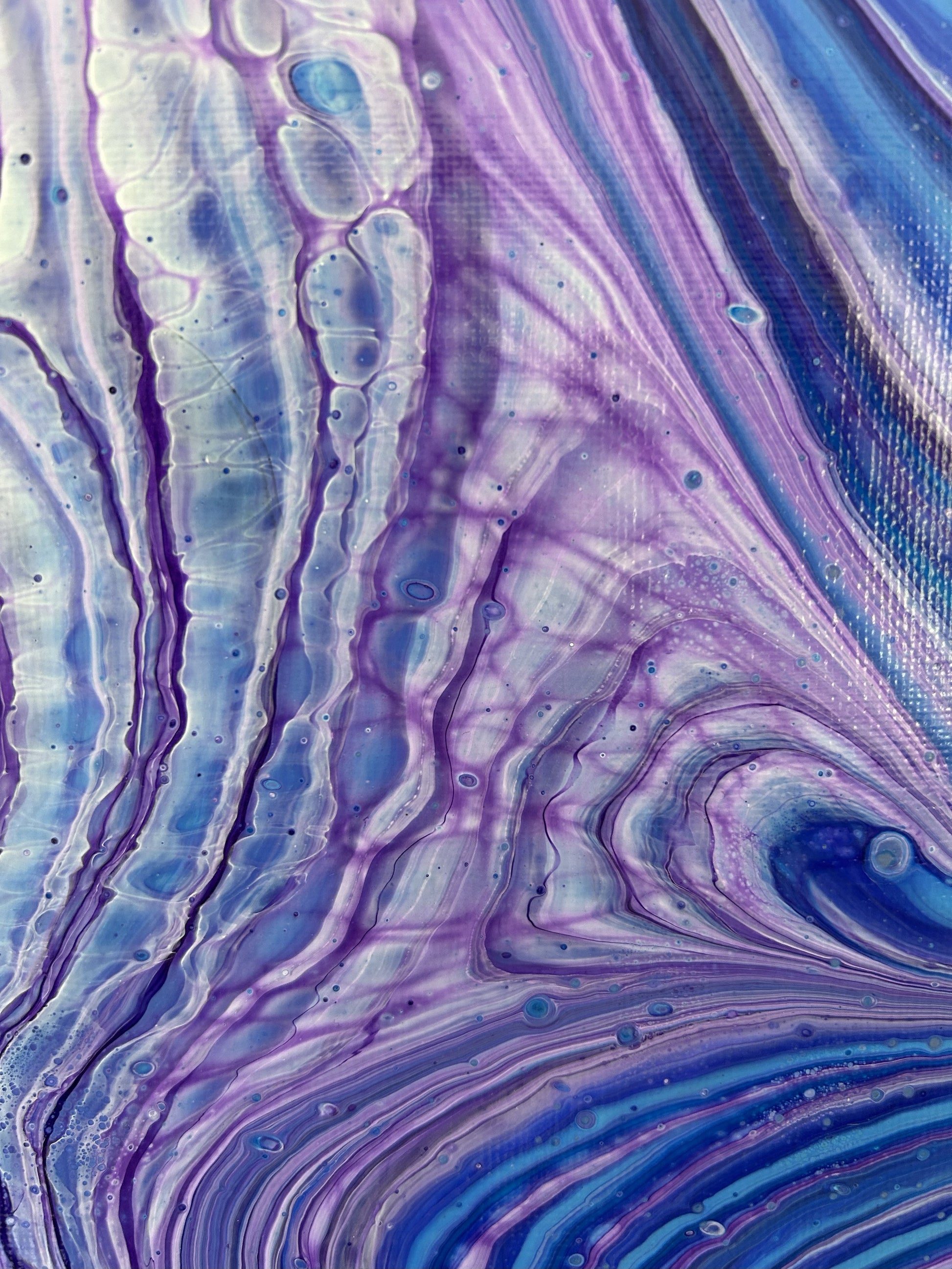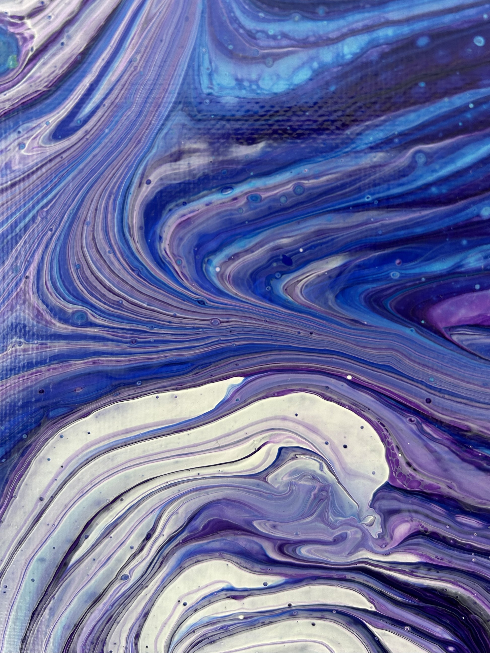 Deep blues and violets combine with white to create wave like motion and details.