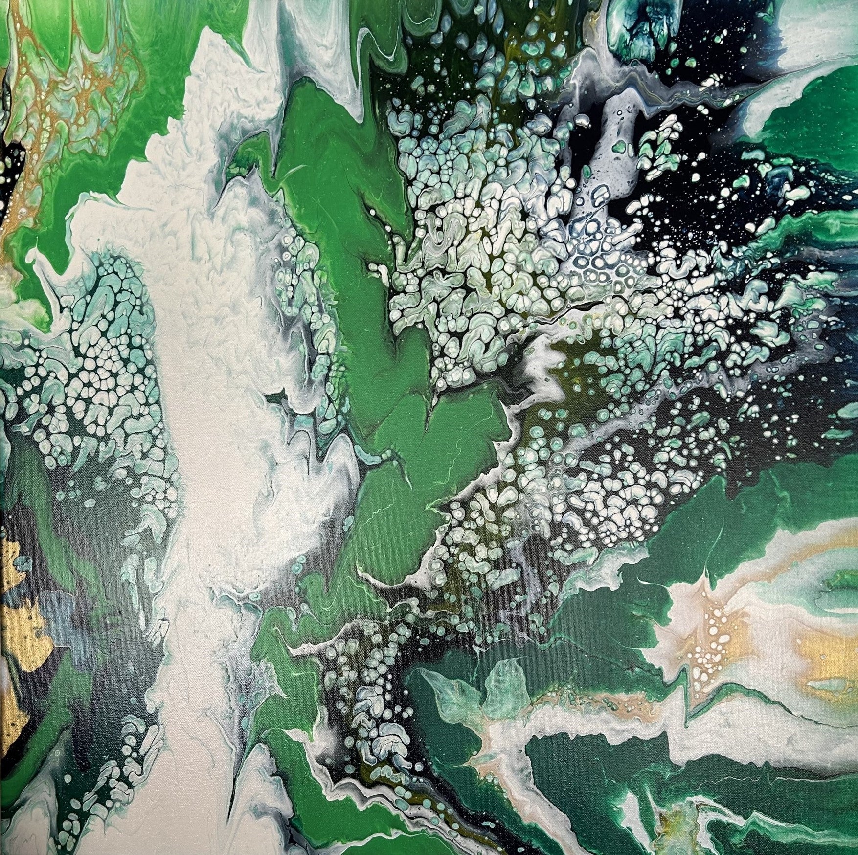 An original acrylic painting on a 70 cm by 70 cm canvas, featuring a complex blend of deep blues and lively greens that capture the essence of Mother Nature in her purest and most magnificent form.